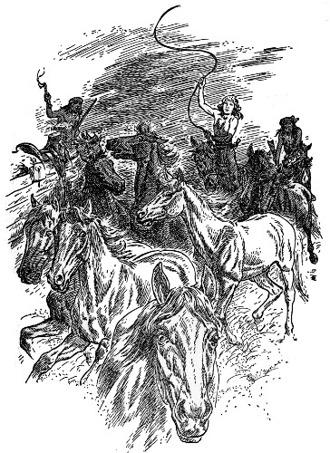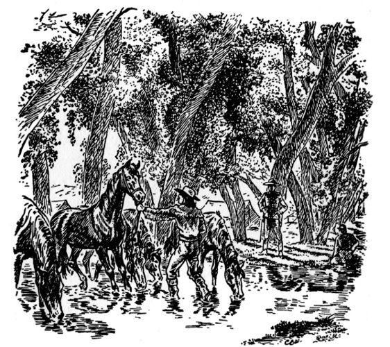 Tie ropes were slipped. Following the smell of water, the horses were off at a gallop.