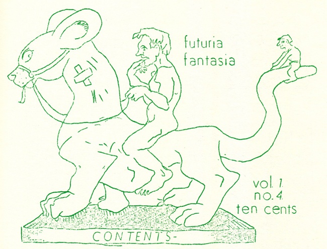 "Let us, by all means, be lucid," said Gorgono to Slith. Slith fluttered his reptile tongue and turned his morbid eyes to me. "Yes," he said, "let us, certainly be lucid, Bradbury. From now on use a contents page in Futuria Fantasia." And he spanked his tail slickly on my typewriter.