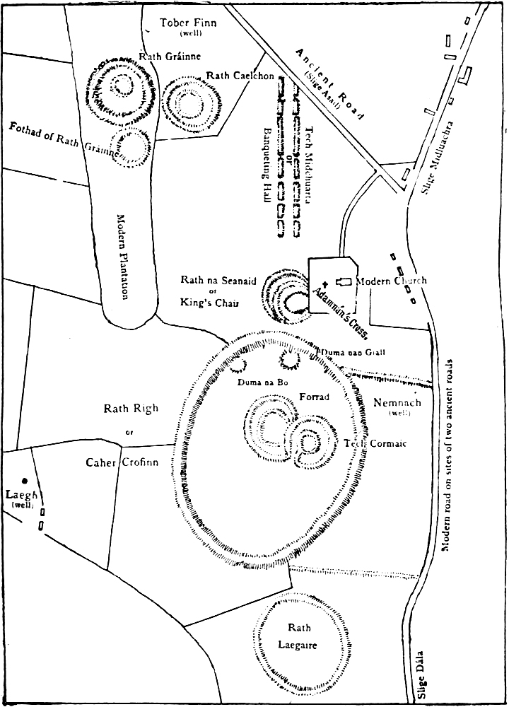 The most important of all is Tara, the chief residence of the over-kings, which is situated on the summit of a gentle green hill, six miles from Navan in Meath, and two miles from the Midland Railway station of Kilmessan. The various mounds, circular ramparts, and other features are plainly marked on the plan given at the beginning of this book; and anyone who walks over the hill with the plan in his hand can easily recognise them.