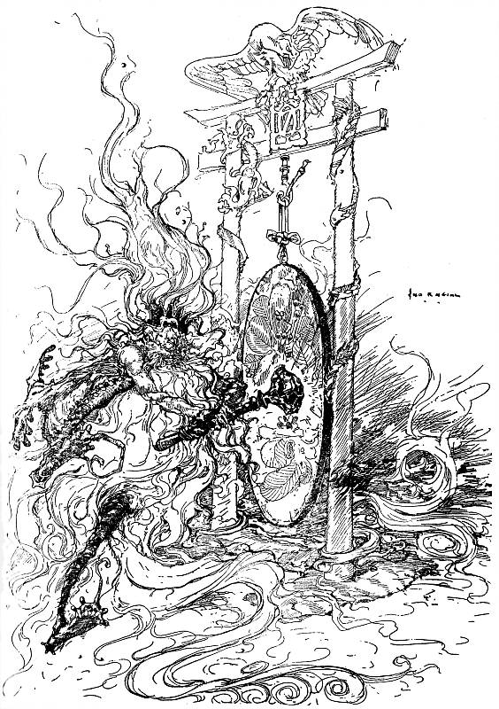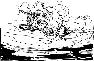 At once they followed her suggestion and moved around the fountain of the Water of Oblivion. There they stood silent and expectant until the earth beyond gave way with a sudden crash and up leaped the powerful form of the First and Foremost, followed by all his grim warriors.