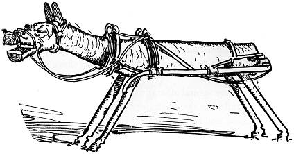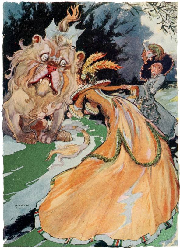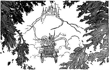 Early the following morning a gay cavalcade set out to[292] visit the famous Sorceress, Glinda the Good. Ozma and Dorothy rode in a chariot drawn by the Cowardly Lion and the Hungry Tiger, while the Sawhorse drew the red wagon in which rode the rest of the party.