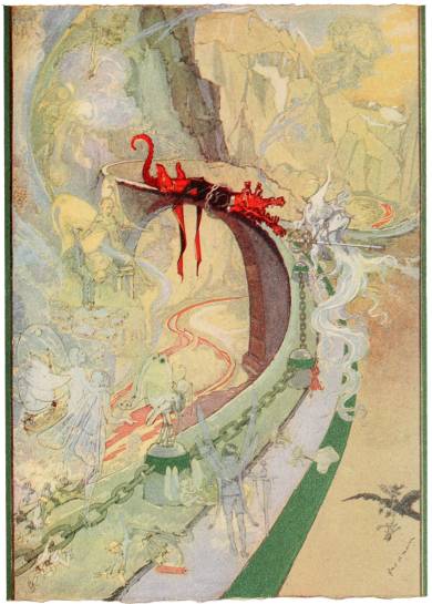 Not so with Roquat, the Nome King. He had not drunk from the Forbidden Fountain and all his former rage against Ozma and Dorothy now inflamed him as fiercely as ever. The sight of General Guph babbling like a happy child and playing with his hands in the cool waters of the fountain astonished and maddened Red Roquat. Seeing that his terrible allies and his own General refused to act, the Nome King turned to order his great army of Nomes to advance from the tunnel and seize the helpless Oz people.