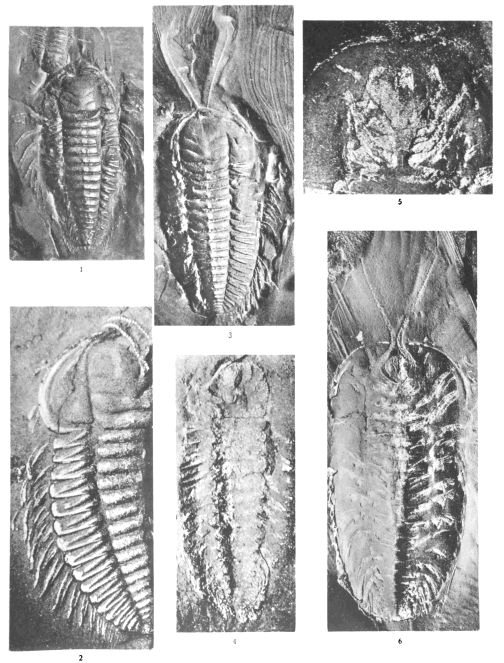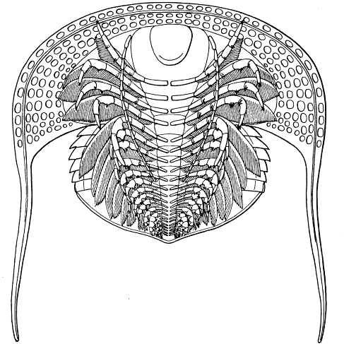 Trilobites are among the most interesting of invertebrate fossils and have long attracted the attention of amateur collectors and men of science. These "three-lobed minerals" have been mentioned or described in books at least since 1698 and now several thousand species are known to palæontologists. To this group of students they are the most characteristic animals of the seas of Palæozoic time, and even though they are usually preserved as dismembered parts, thousands upon thousands of "whole ones" are stored in the museums of the world. By "whole ones" perfect individuals are not meant, for before they became fossils the wear and tear of their time and the process of decomposition had taken away all the softer parts and even most of the harder exterior covering. What is usually preserved and revealed to us when the trilobites weather out of the embrace of their entombing rocks is the test, the hard shell of the upper or dorsal side. From time to time fragments of the under or limb-bearing side had been discovered, first by Elkanah Billings, but before 1876 there was no known place to which one could go to dig out of the ground trilobites retaining the parts of the ventral side.