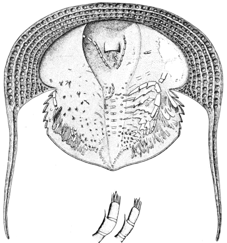 Ceraurus pleurexanthemus Green. A restoration of the ventral surface and appendages, made by Doctor Elvira Wood, under the supervision of the writer, from data obtained from the translucent slices prepared and described by Doctor Walcott. × 5.
