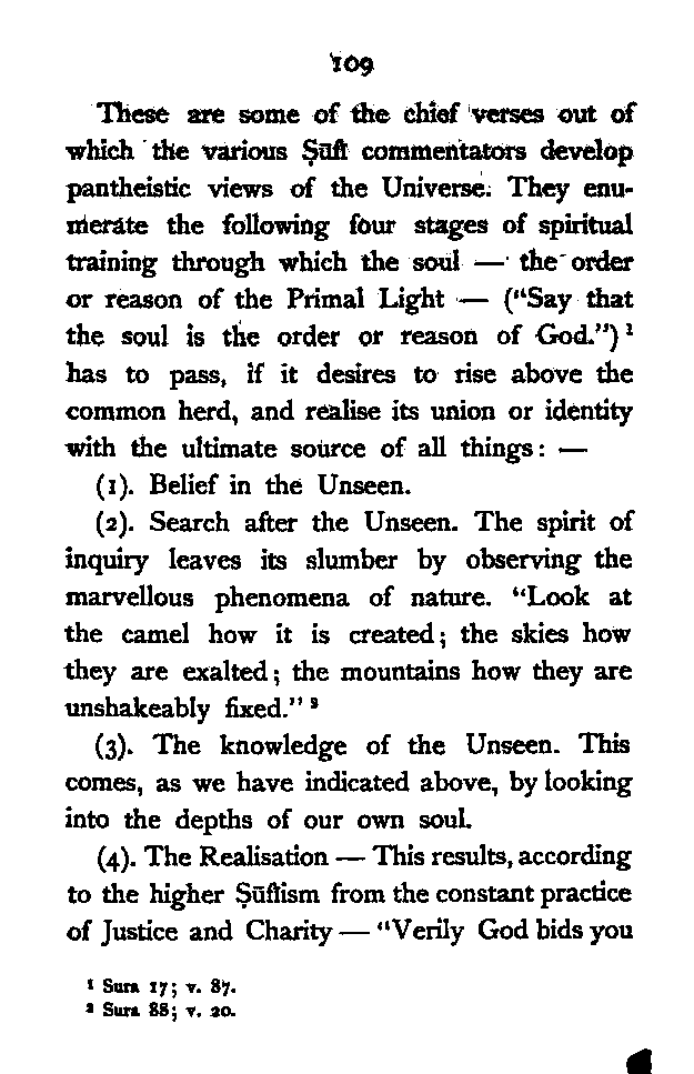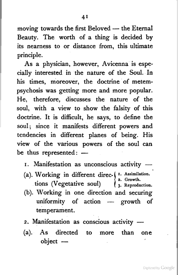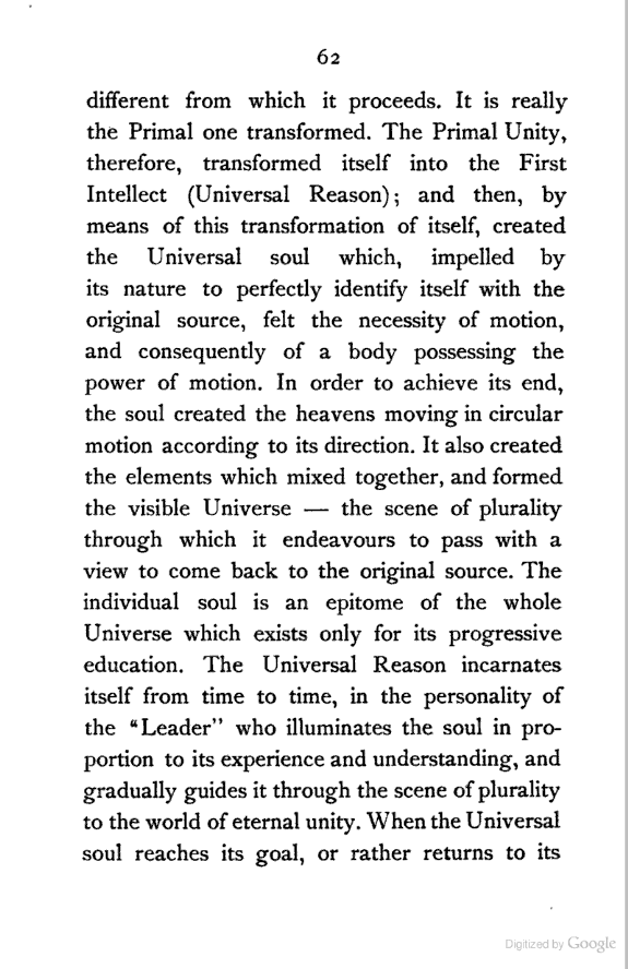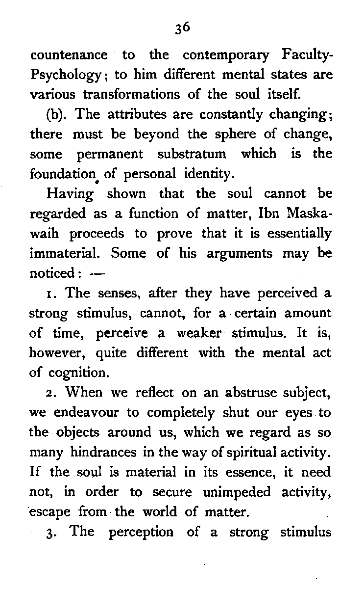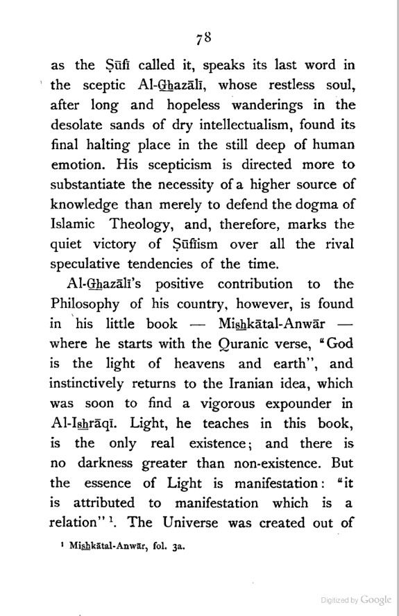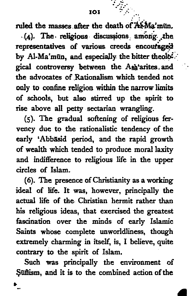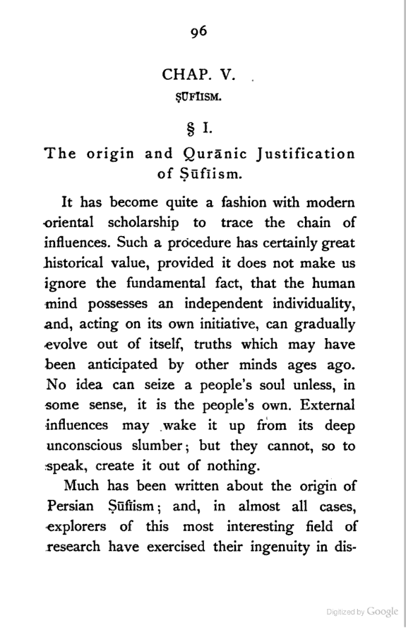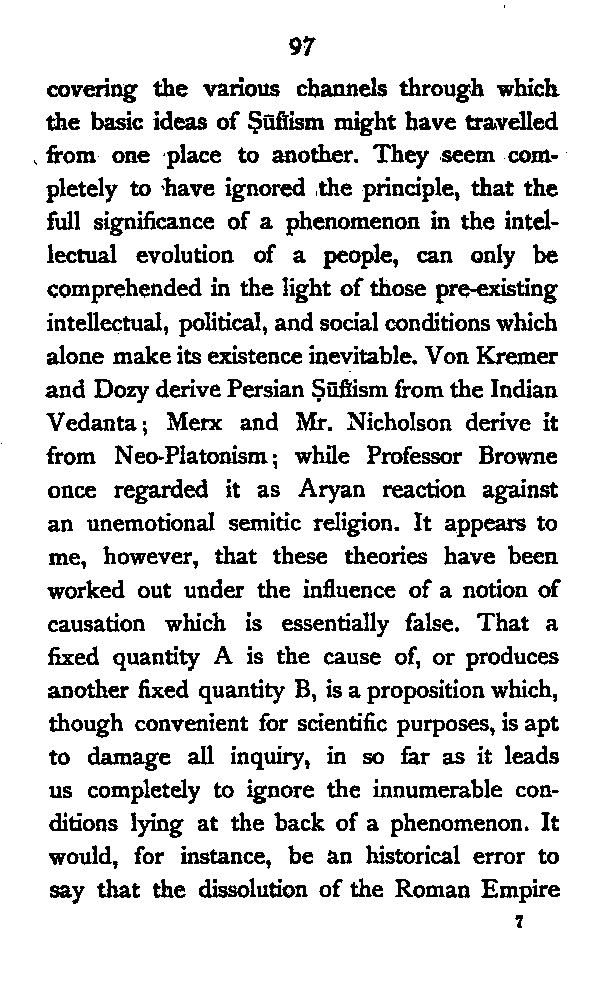 (b) I have discussed the subject of Ṣūfīism in a more scientific manner, and have attempted to bring out the intellectual conditions which necessitated such a phenomenon. In opposition, [Pg xi] therefore, to the generally accepted view I have tried to maintain that Ṣūfīism is a necessary product of the play of various intellectual and moral forces which would necessarily awaken the slumbering soul to a higher ideal of life.