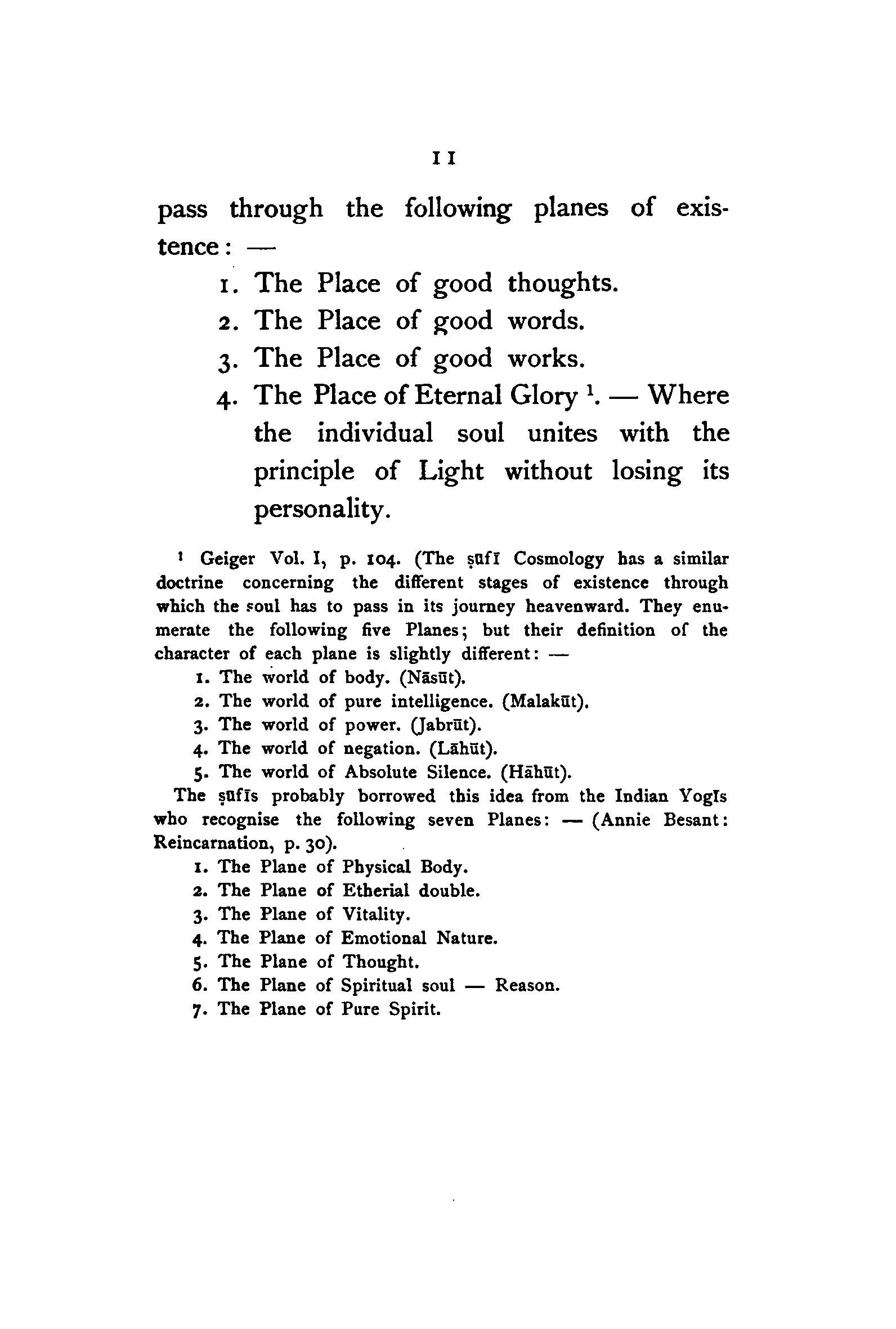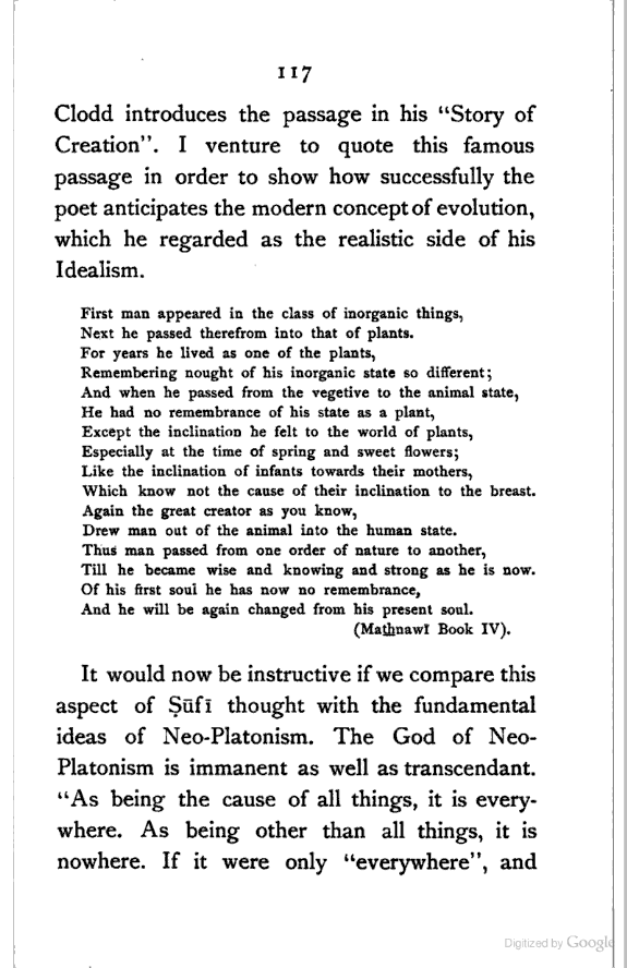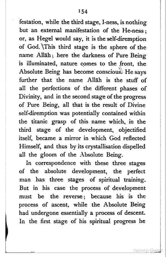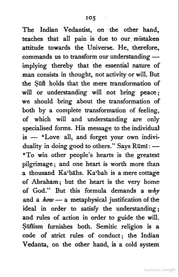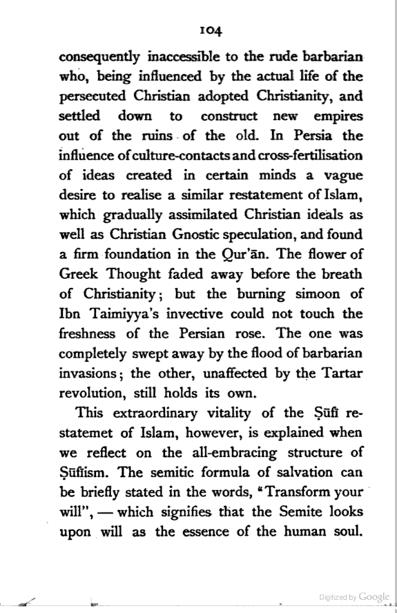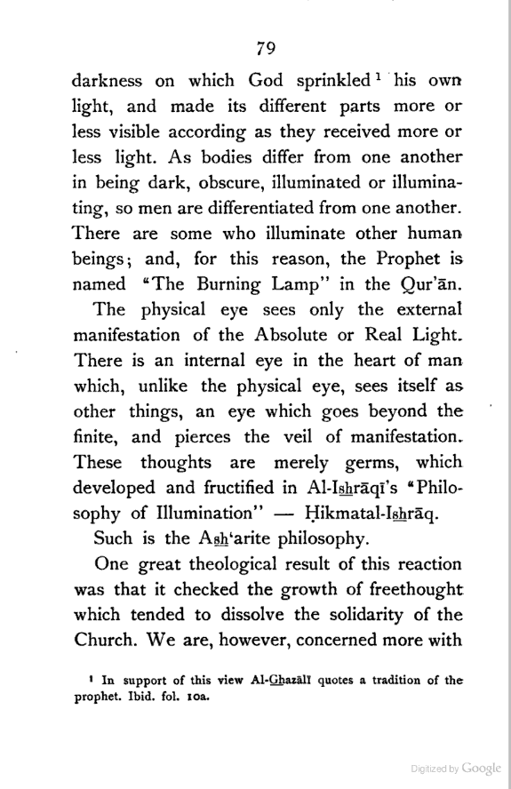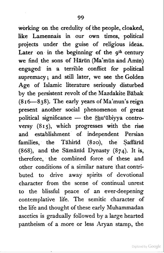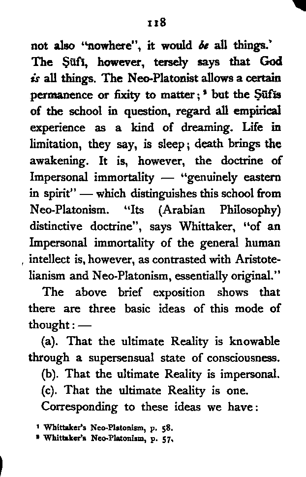 (b) I have discussed the subject of Ṣūfīism in a more scientific manner, and have attempted to bring out the intellectual conditions which necessitated such a phenomenon. In opposition, [Pg xi] therefore, to the generally accepted view I have tried to maintain that Ṣūfīism is a necessary product of the play of various intellectual and moral forces which would necessarily awaken the slumbering soul to a higher ideal of life.