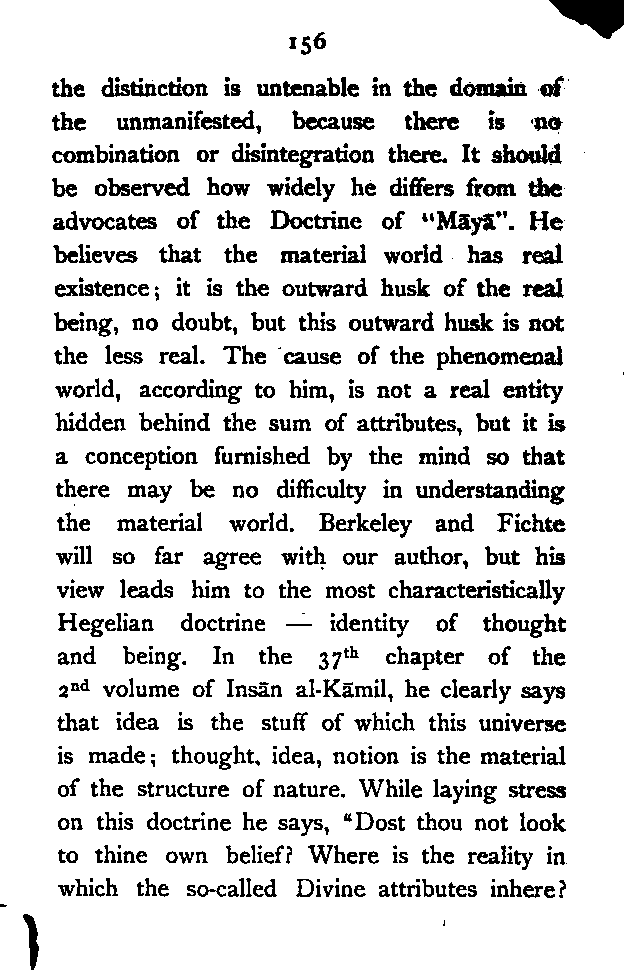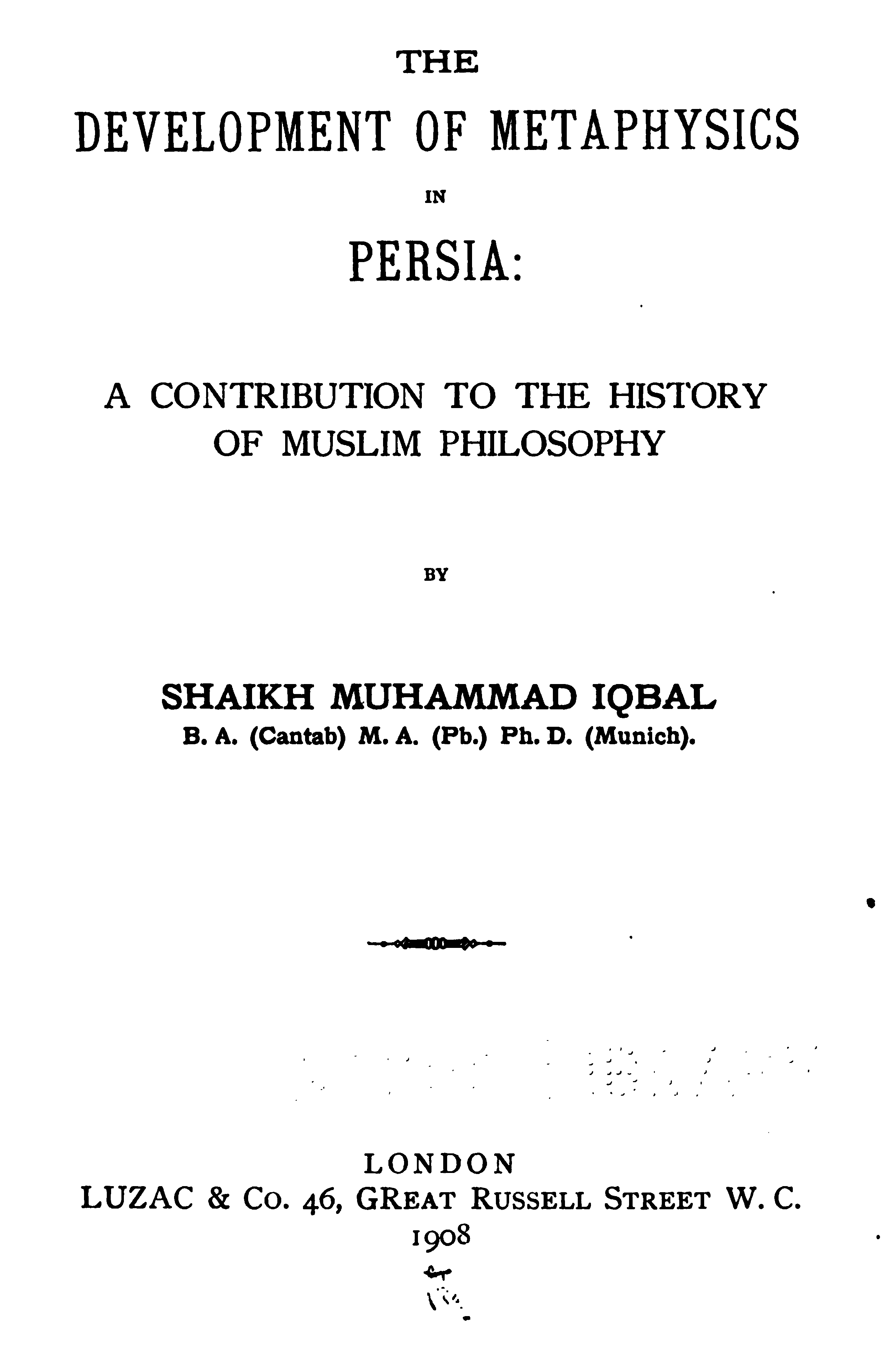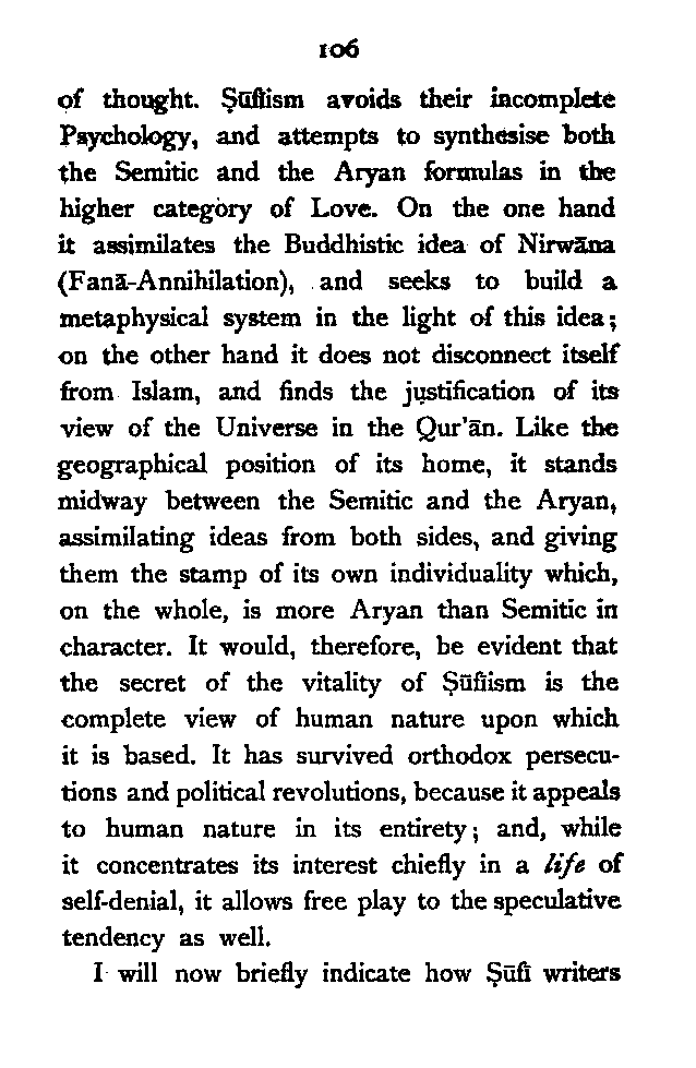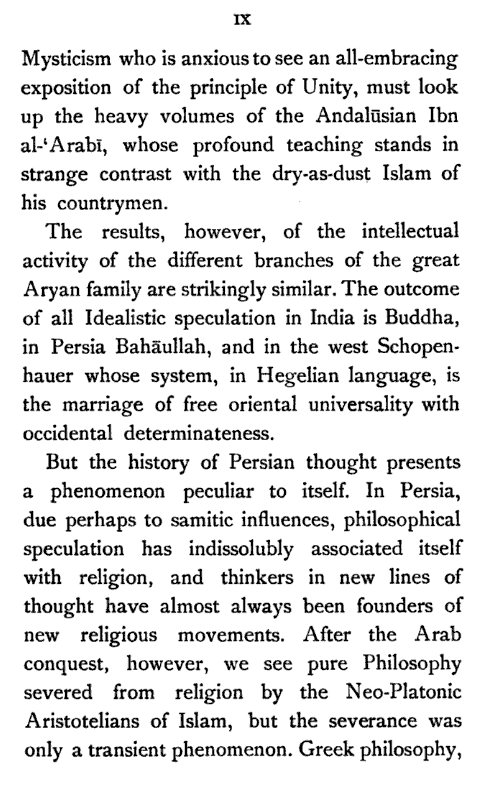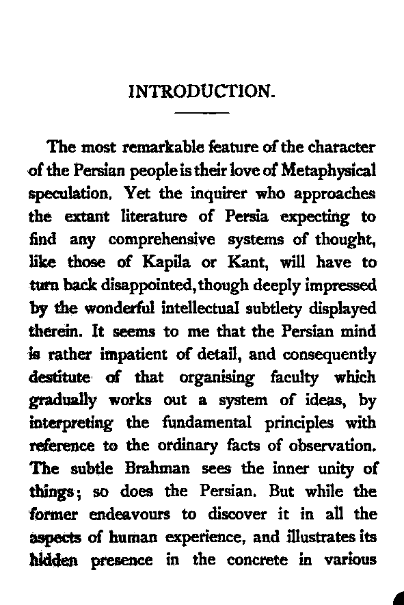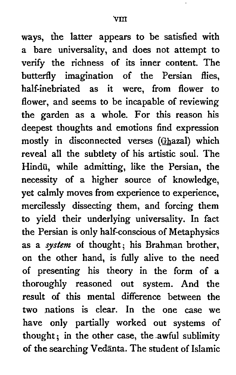 The most remarkable feature of the character of the Persian people is their love of Metaphysical speculation. Yet the inquirer who approaches the extant literature of Persia expecting to find any comprehensive systems of thought, like those of Kapila or Kant, will have to turn back disappointed, though deeply impressed by the wonderful intellectual subtlety displayed therein. It seems to me that the Persian mind is rather impatient of detail, and consequently destitute of that organising faculty which gradually works out a system of ideas, by interpreting the fundamental principles with reference to the ordinary facts of observation. The subtle Brahman sees the inner unity of things; so does the Persian. But while the former endeavours to discover it in all the aspects of human experience, and illustrates its hidden presence in the concrete in various [Pg viii] ways, the latter appears to be satisfied with a bare universality, and does not attempt to verify the richness of its inner content. The butterfly imagination of the Persian flies, half-inebriated as it were, from flower to flower, and seems to be incapable of reviewing the garden as a whole. For this reason his deepest thoughts and emotions find expression mostly in disconnected verses (Ghazal) which reveal all the subtlety of his artistic soul. The Hindū, while admitting, like the Persian, the necessity of a higher source of knowledge, yet calmly moves from experience to experience, mercilessly dissecting them, and forcing them to yield their underlying universality. In fact the Persian is only half-conscious of Metaphysics as a system of thought; his Brahman brother, on the other hand, is fully alive to the need of presenting his theory in the form of a thoroughly reasoned out system. And the result of this mental difference between the two nations is clear. In the one case we have only partially worked out systems of thought; in the other case, the awful sublimity of the searching Vedānta. The student of Islamic [Pg ix] Mysticism who is anxious to see an all-embracing exposition of the principle of Unity, must look up the heavy volumes of the Andalūsian Ibn al-‘Arabī, whose profound teaching stands in strange contrast with the dry-as-dust Islam of his countrymen.