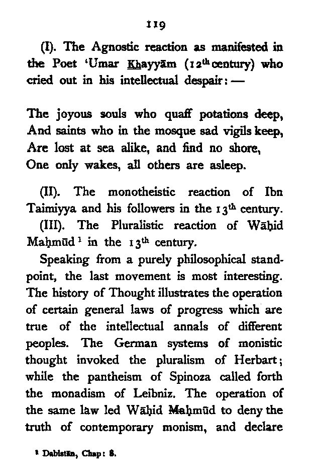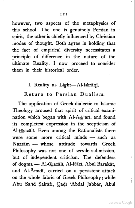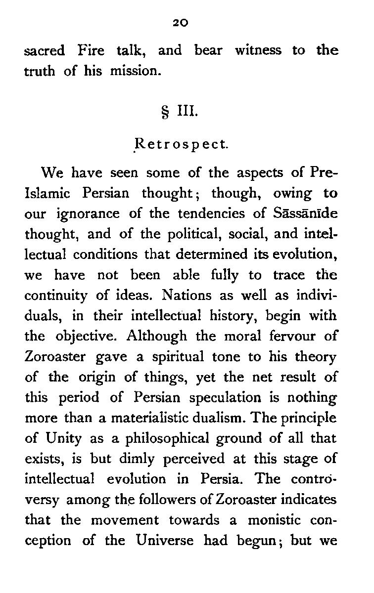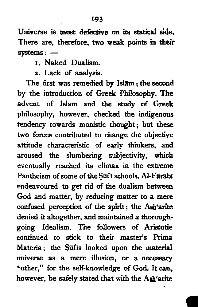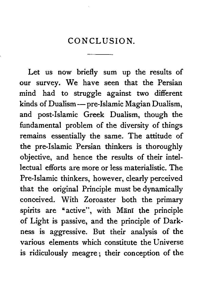 Let us now briefly sum up the results of our survey. We have seen that the Persian mind had to struggle against two different kinds of Dualism—pre-Islamic Magian Dualism, and post-Islamic Greek Dualism, though the fundamental problem of the diversity of things remains essentially the same. The attitude of the pre-Islamic Persian thinkers is thoroughly objective, and hence the results of their intellectual efforts are more or less materialistic. The Pre-Islamic thinkers, however, clearly perceived that the original Principle must be dynamically conceived. With Zoroaster both the primary spirits are "active", with Mānī the principle of Light is passive, and the principle of Darkness is aggressive. But their analysis of the various elements which constitute the Universe is ridiculously meagre; their conception of the [Pg 193] Universe is most defective on its statical side. There are, therefore, two weak points in their systems:—