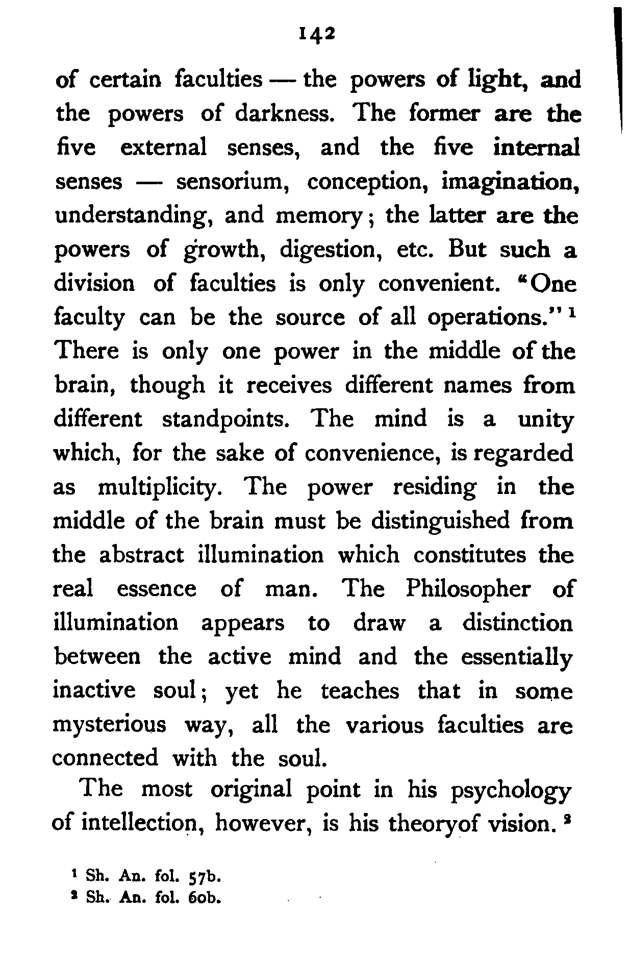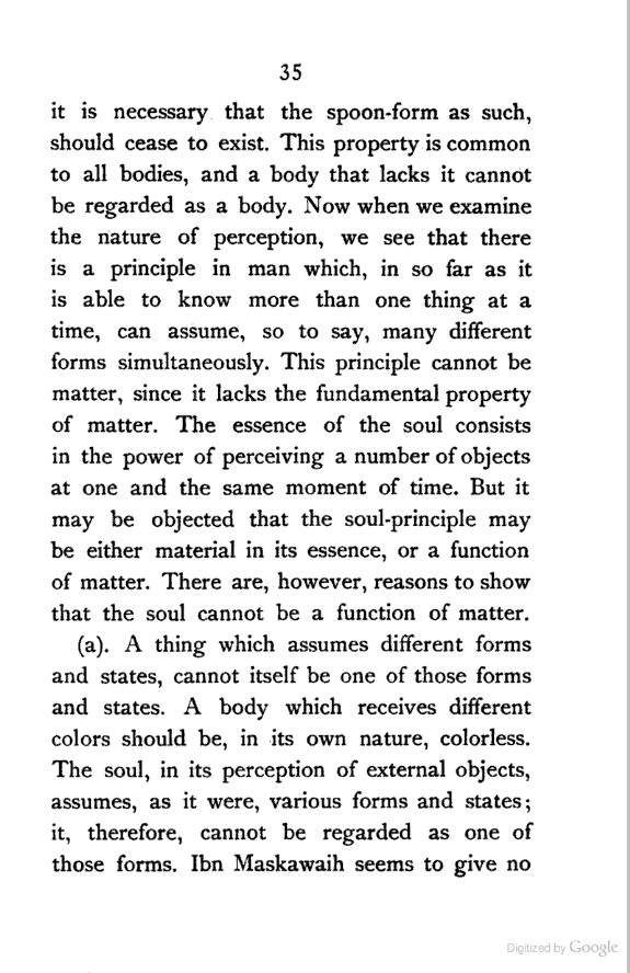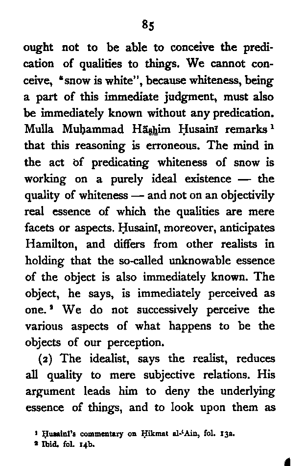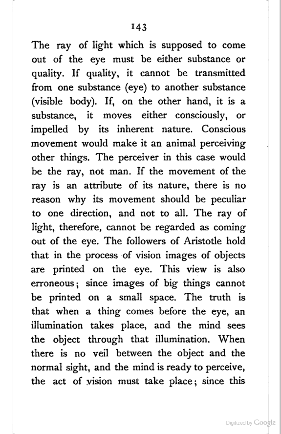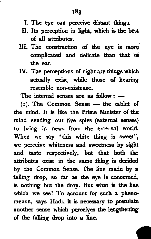 (1). The Common Sense—the tablet of the mind. It is like the Prime Minister of the mind sending out five spies (external senses) to bring in news from the external world. When we say "this white thing is sweet", we perceive whiteness and sweetness by sight and taste respectively, but that both the attributes exist in the same thing is decided by the Common Sense. The line made by a falling drop, so far as the eye is concerned, is nothing but the drop. But what is the line which we see? To account for such a phenomenon, says Hādī, it is necessary to postulate another sense which perceives the lengthening of the falling drop into a line. [Pg 184]