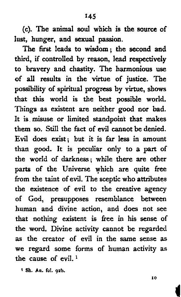But it is the spirit which distinguishes man from other animals. This essence of humanity is a "unity", not oneness. It perceives the Universal by itself, and the particular through the external and the internal senses. It is the shadow of the Absolute Light, and like it [Pg 185] manifests itself in various ways—comprehending multiplicity in its unity. There is no necessary relation between the spirit and the body. The former is non-temporal and non-spatial; hence it is changeless, and has the power of judging the visible multiplicity. In sleep the spirit uses the "ideal body" which functions like the physical body; in waking life it uses the ordinary physical body. It follows, therefore, that the spirit stands in need of neither, and uses both at will. Hādī does not follow Plato in his doctrine of transmigration, the different forms of which he refutes at length. The spirit to him is immortal, and reaches its original home—Absolute Light—by the gradual perfection of its faculties. The various stages of the development of reason are as follows:—