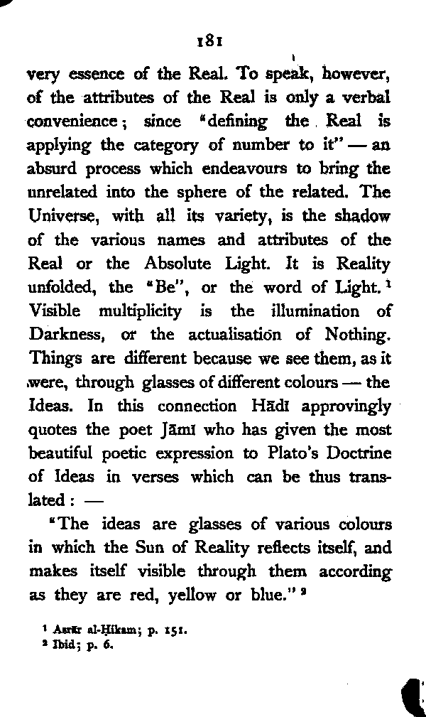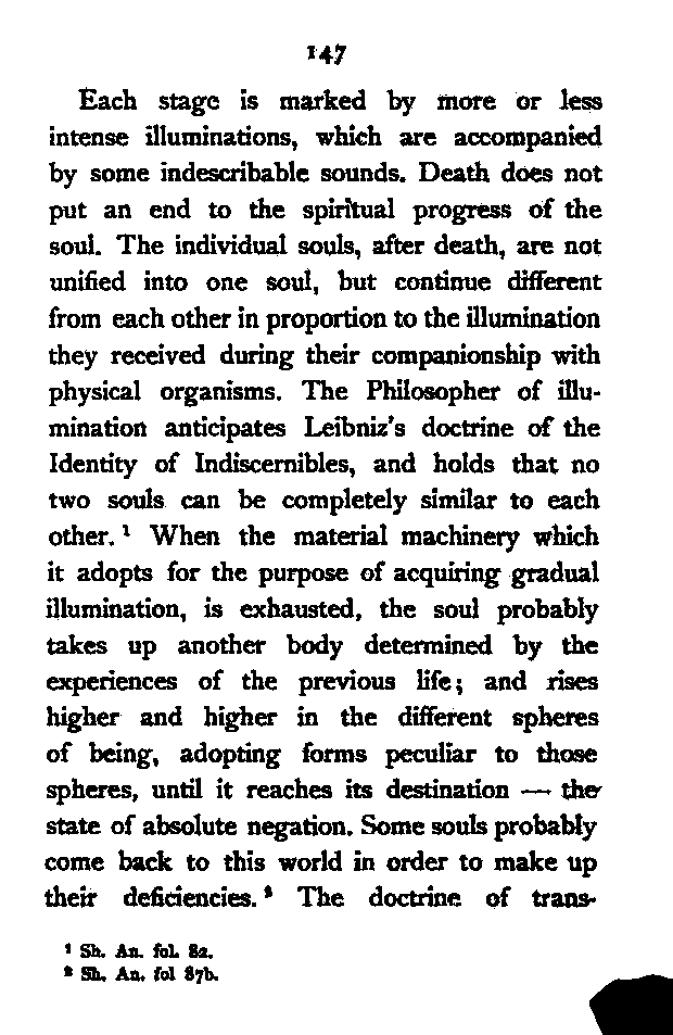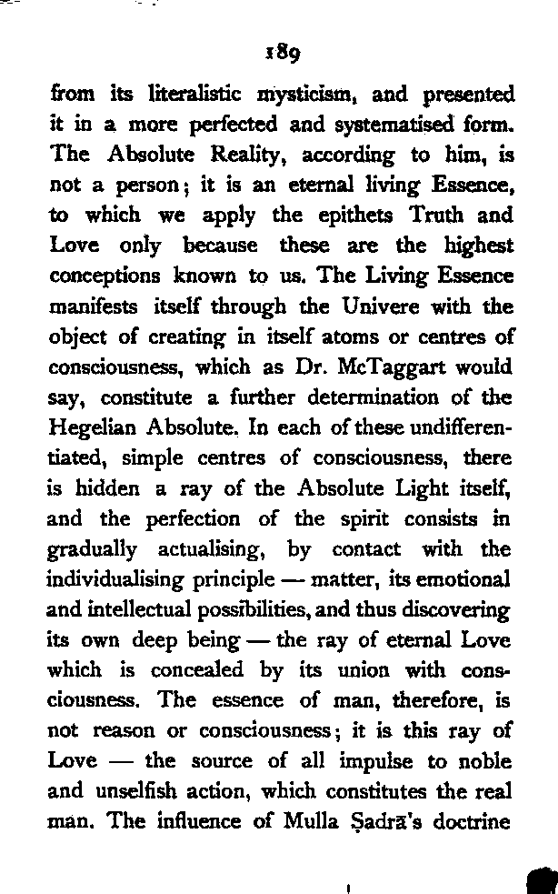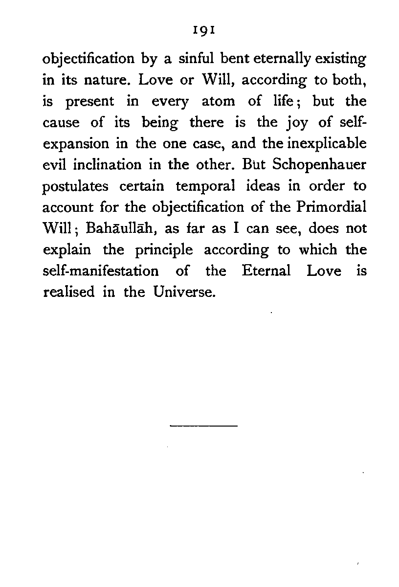After the execution of ‘Alī Muḥammad Bāb, Bahāullāh, one of his principal disciples who were collectively called "The First Unity", took up the mission, and proclaimed himself the originator of the new dispensation, the absent Imām whose manifestation the Bāb had foretold. He freed the doctrine of his master [Pg 189] from its literalistic mysticism, and presented it in a more perfected and systematised form. The Absolute Reality, according to him, is not a person; it is an eternal living Essence, to which we apply the epithets Truth and Love only because these are the highest conceptions known to us. The Living Essence manifests itself through the Univere with the object of creating in itself atoms or centres of consciousness, which as Dr. McTaggart would say, constitute a further determination of the Hegelian Absolute. In each of these undifferentiated, simple centres of consciousness, there is hidden a ray of the Absolute Light itself, and the perfection of the spirit consists in gradually actualising, by contact with the individualising principle—matter, its emotional and intellectual possibilities, and thus discovering its own deep being—the ray of eternal Love which is concealed by its union with consciousness. The essence of man, therefore, is not reason or consciousness; it is this ray of Love—the source of all impulse to noble and unselfish action, which constitutes the real man. The influence of Mulla Ṣadrā's doctrine [Pg 190] of the incorporeality of Imagination is here apparent. Reason, which stands higher than Imagination in the scale of evolution, is not a necessary condition, according to Mulla Ṣadrā, of immortality. In all forms of life there is an immortal spiritual part, the ray of Eternal Love, which has no necessary connection with self-consciousness or reason, and survives after the death of the body. Salvation, then, which to Buddha consists in the starving out of the mind-atoms by extinguishing desire, to Bahāullāh lies in the discovery of the essence of love which is hidden in the atoms of consciousness themselves.[190:1] Both, however, agree that after death thoughts and characters of men remain, subject to other forces of a similar character, in the spiritual world, waiting for another opportunity to find a suitable physical accompaniment in order to continue the process of discovery (Bahāullāh) or destruction (Buddha). To Bahāullāh the conception of Love is higher than the conception of Will. Schopenhauer conceived reality as Will which was driven to [Pg 191] objectification by a sinful bent eternally existing in its nature. Love or Will, according to both, is present in every atom of life; but the cause of its being there is the joy of self-expansion in the one case, and the inexplicable evil inclination in the other. But Schopenhauer postulates certain temporal ideas in order to account for the objectification of the Primordial Will; Bahāullāh, as far as I can see, does not explain the principle according to which the self-manifestation of the Eternal Love is realised in the Universe.