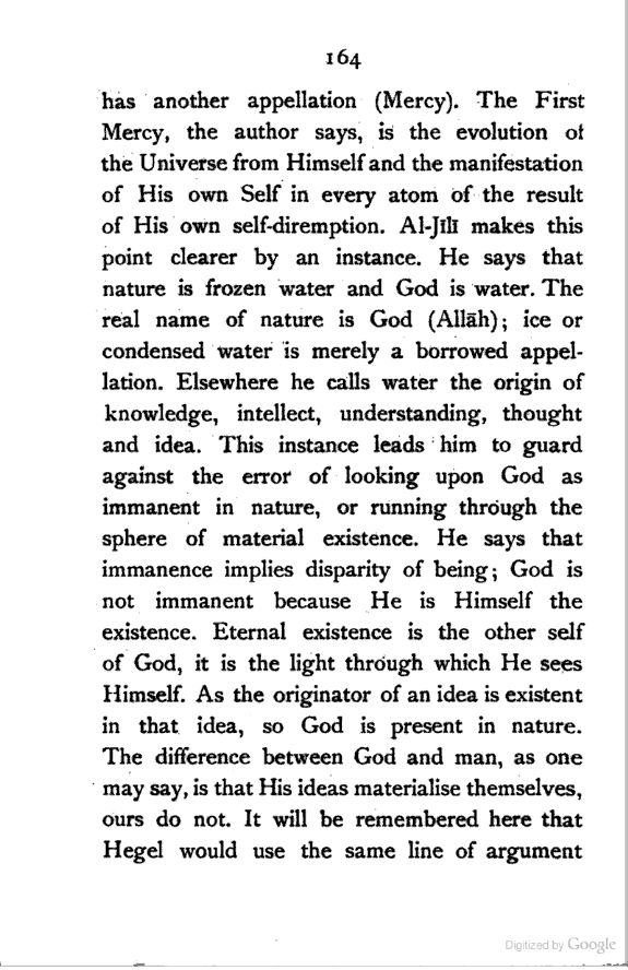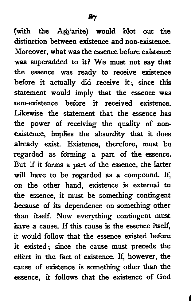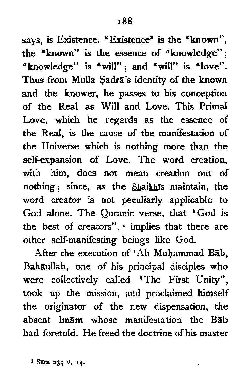 The young Persian seer looks upon Reality as an essence which brooks no distinction of substance and attribute. The first bounty or self-expansion of the Ultimate Essence, he [Pg 188] says, is Existence. "Existence" is the "known", the "known" is the essence of "knowledge"; "knowledge" is "will"; and "will" is "love". Thus from Mulla Ṣadrā's identity of the known and the knower, he passes to his conception of the Real as Will and Love. This Primal Love, which he regards as the essence of the Real, is the cause of the manifestation of the Universe which is nothing more than the self-expansion of Love. The word creation, with him, does not mean creation out of nothing; since, as the Shaikhīs maintain, the word creator is not peculiarly applicable to God alone. The Quranic verse, that "God is the best of creators",[188:1] implies that there are other self-manifesting beings like God.