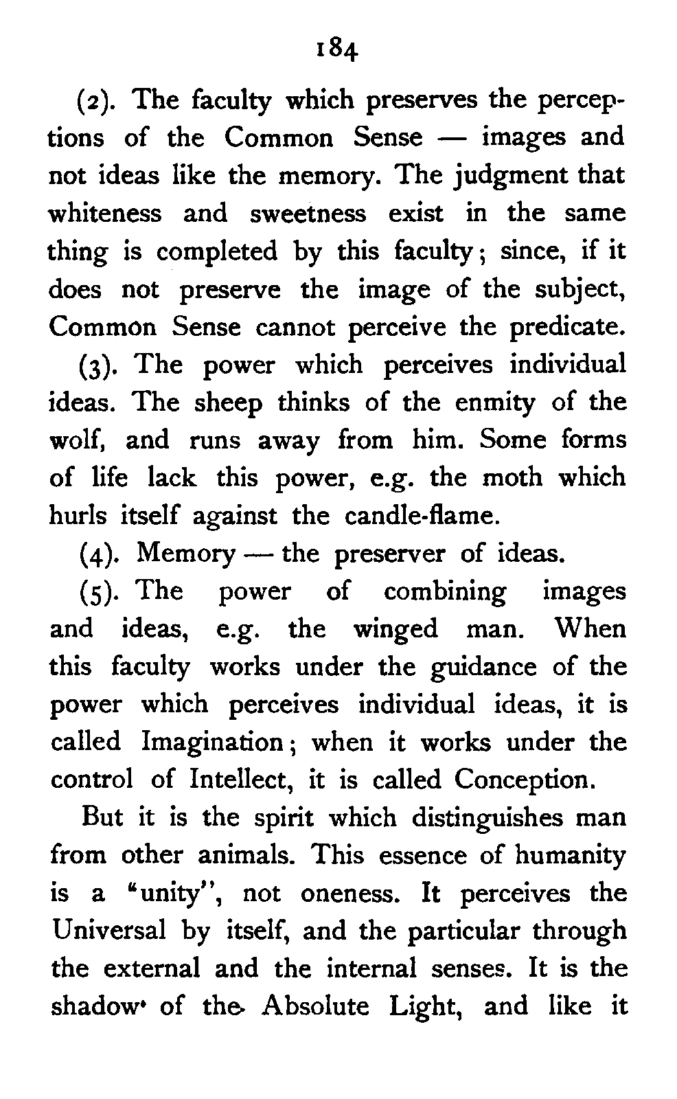 (5). The power of combining images and ideas, e.g. the winged man. When this faculty works under the guidance of the power which perceives individual ideas, it is called Imagination; when it works under the control of Intellect, it is called Conception.