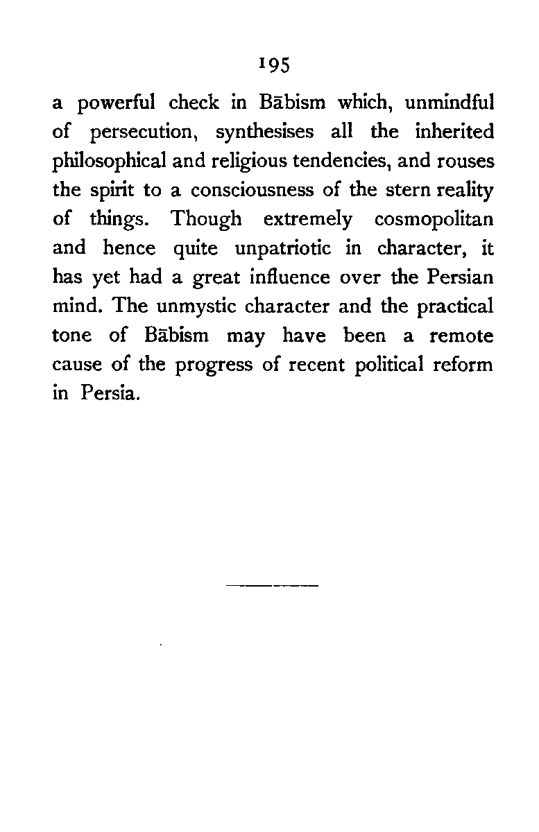 The first was remedied by Islām; the second by the introduction of Greek Philosophy. The advent of Islām and the study of Greek philosophy, however, checked the indigenous tendency towards monistic thought; but these two forces contributed to change the objective attitude characteristic of early thinkers, and aroused the slumbering subjectivity, which eventually reached its climax in the extreme Pantheism of some of the Ṣūfī schools. Al-Fārābī endeavoured to get rid of the dualism between God and matter, by reducing matter to a mere confused perception of the spirit; the Ash‘arite denied it altogether, and maintained a thoroughgoing Idealism. The followers of Aristotle continued to stick to their master's Prima Materia; the Ṣūfīs looked upon the material universe as a mere illusion, or a necessary "other," for the self-knowledge of God. It can, however, be safely stated that with the Ash‘arite [Pg 194] Idealism, the Persian mind got over the foreign dualism of God and matter, and, fortified with new philosophical ideas, returned to the old dualism of light and darkness. The Shaikh-al-Ishrāq combines the objective attitude of Pre-Islamic Persian thinkers with the subjective attitude of his immediate predecessors, and restates the Dualism of Zoroaster in a much more philosophical and spiritualised form. His system recognises the claims of both the subject and the object. But all these monistic systems of thought were met by the Pluralism of Wāḥid Maḥmūd, who taught that reality is not one, but many—primary living units which combine in various ways, and gradually rise to perfection by passing through an ascending scale of forms. The reaction of Wāḥid Maḥmūd was, however, an ephemeral phenomenon. The later Sūfīs as well as philosophers proper gradually transformed or abandoned the Neo-Platonic theory of Emanation, and in later thinkers we see a movement through Neo-Platonism towards real Platonism which is approached by Mulla Hādī's Philosophy. But pure speculation and dreamy mysticism undergo [Pg 195] a powerful check in Bābism which, unmindful of persecution, synthesises all the inherited philosophical and religious tendencies, and rouses the spirit to a consciousness of the stern reality of things. Though extremely cosmopolitan and hence quite unpatriotic in character, it has yet had a great influence over the Persian mind. The unmystic character and the practical tone of Bābism may have been a remote cause of the progress of recent political reform in Persia.