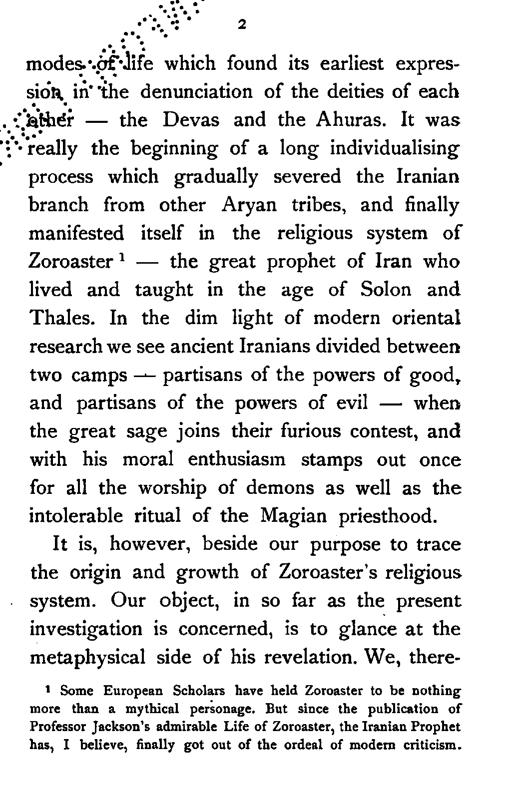 To Zoroaster—the ancient sage of Iran—must always be assigned the first place in the intellectual history of Iranian Aryans who, wearied of constant roaming, settled down to an agricultural life at a time when the Vedic Hymns were still being composed in the plains of Central Asia. This new mode of life and the consequent stability of the institution of property among the settlers, made them hated by other Aryan tribes who had not yet shaken off their original nomadic habits, and occasionally plundered their more civilised kinsmen. Thus grew up the conflict between the two [Pg 2] modes of life which found its earliest expression in the denunciation of the deities of each other—the Devas and the Ahuras. It was really the beginning of a long individualising process which gradually severed the Iranian branch from other Aryan tribes, and finally manifested itself in the religious system of Zoroaster[2:1]—the great prophet of Iran who lived and taught in the age of Solon and Thales. In the dim light of modern oriental research we see ancient Iranians divided between two camps—partisans of the powers of good, and partisans of the powers of evil—when the great sage joins their furious contest, and with his moral enthusiasm stamps out once for all the worship of demons as well as the intolerable ritual of the Magian priesthood.