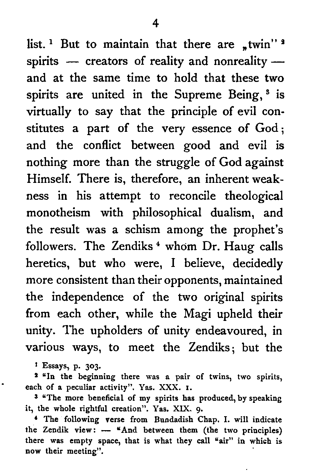 Geiger, in his "Civilisation of Eastern Iranians in Ancient Times", points out that Zoroaster inherited two fundamental principles from his Aryan ancestry.—(1) There is law in Nature. (2) There is conflict in Nature. It is the observation of law and conflict in the vast panorama of being that constitutes the philosophical foundation of his system. The problem before him was to reconcile the existence of evil with the eternal goodness of God. His predecessors worshipped a plurality of good spirits all of which he reduced to a unity and called it Ahuramazda. On the other hand he reduced all the powers of evil to a similar unity and called it Druj-Ahriman. Thus by a process of unification he arrived at two fundamental principles which, as Haug shows, he looked upon not as two independent activities, but as two parts or rather aspects of the same Primary Being. Dr. Haug, therefore, holds that the Prophet of ancient Iran was theologically a monotheist and philosophically a [Pg 4] dualist.[4:1] But to maintain that there are "twin"[4:2] spirits—creators of reality and nonreality—and at the same time to hold that these two spirits are united in the Supreme Being,[4:3] is virtually to say that the principle of evil constitutes a part of the very essence of God; and the conflict between good and evil is nothing more than the struggle of God against Himself. There is, therefore, an inherent weakness in his attempt to reconcile theological monotheism with philosophical dualism, and the result was a schism among the prophet's followers. The Zendiks[4:4] whom Dr. Haug calls heretics, but who were, I believe, decidedly more consistent than their opponents, maintained the independence of the two original spirits from each other, while the Magi upheld their unity. The upholders of unity endeavoured, in various ways, to meet the Zendiks; but the [Pg 5] very fact that they tried different phrases and expressions to express the unity of the "Primal Twins", indicates dissatisfaction with their own philosophical explanations, and the strength of their opponent's position. Shahrastānī[5:1] describes briefly the different explanations of the Magi. The Zarwānians look upon Light and Darkness as the sons of Infinite Time. The Kiyūmarthiyya hold that the original principle was Light which was afraid of a hostile power, and it was this thought of an adversary mixed with fear that led to the birth of Darkness. Another branch of Zarwānians maintain that the original principle doubted concerning something and this doubt produced Ahriman. Ibn Ḥazm[5:2] speaks of another sect who explained the principle of Darkness as the obscuration of a part of the fundamental principle of Light itself.