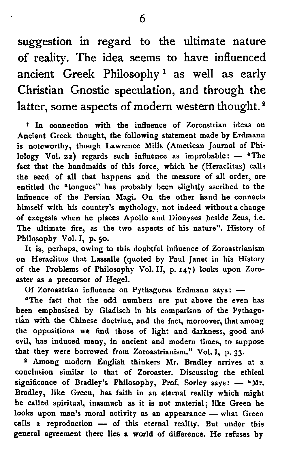 Whether the philosophical dualism of Zoroaster can be reconciled with his monotheism or not, it is unquestionable that, from a metaphysical standpoint, he has made a profound [Pg 6] suggestion in regard to the ultimate nature of reality. The idea seems to have influenced ancient Greek Philosophy[6:1] as well as early Christian Gnostic speculation, and through the latter, some aspects of modern western thought.[6:2] [Pg 7] As a thinker he is worthy of great respect not only because he approached the problem of objective multiplicity in a philosophical spirit; but also because he endeavoured, having been led to metaphysical dualism, to reduce his Primary Duality to a higher unity. He seems to have perceived, what the mystic shoemaker of Germany perceived long after him, that the diversity of nature could not be explained without postulating a principle of negativity or self-differentiation in the very nature of God. His immediate successors did not, however, quite realise the deep significance of their master's suggestions; but we shall see, as we advance, how Zoroaster's idea finds a more spiritualised expression in some of the aspects of later Persian thought.