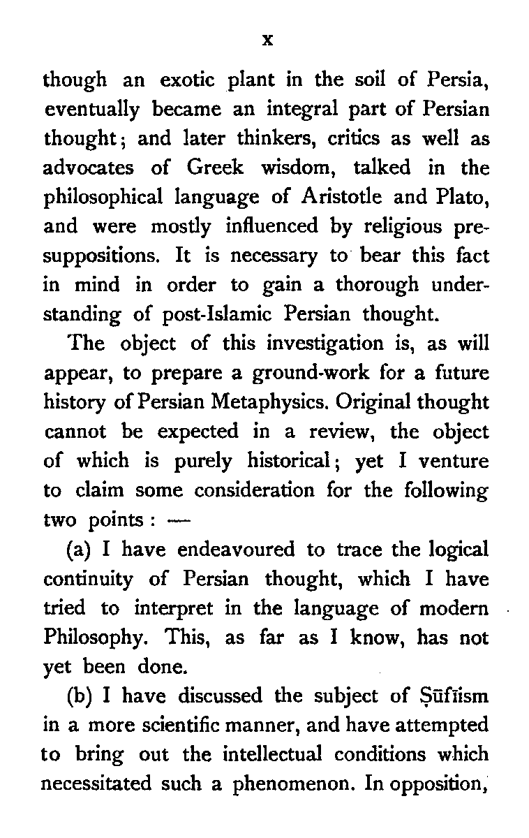 (a) I have endeavoured to trace the logical continuity of Persian thought, which I have tried to interpret in the language of modern Philosophy. This, as far as I know, has not yet been done.