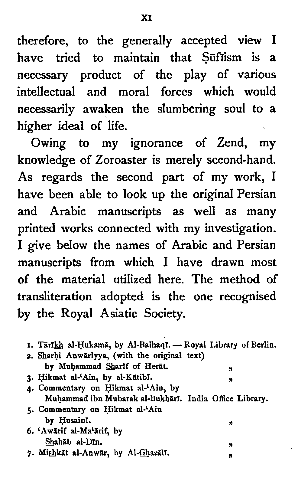 Owing to my ignorance of Zend, my knowledge of Zoroaster is merely second-hand. As regards the second part of my work, I have been able to look up the original Persian and Arabic manuscripts as well as many printed works connected with my investigation. I give below the names of Arabic and Persian manuscripts from which I have drawn most of the material utilized here. The method of transliteration adopted is the one recognised by the Royal Asiatic Society.