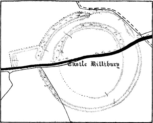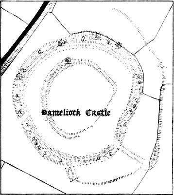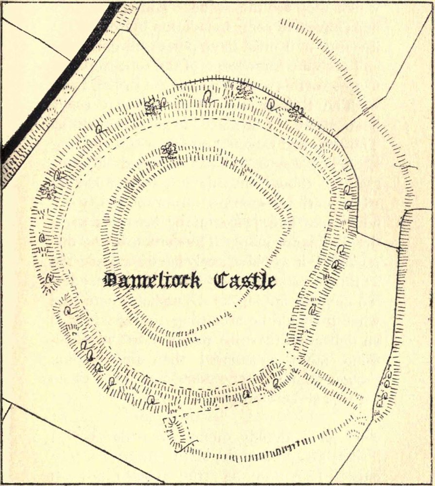Dameliock or Dimilioc still exists as a formidable earthwork, and retains the name.[25] It is mentioned in ‘Domesday Book’ under the term Damelihoc. ‘Domesday Book’ is a mere rent-roll and does not deal in descriptions, but[Pg 67] the name is significant if Gilbert[26] is correct in his interpretation of it as ‘the place of battle.’