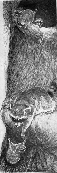 It was too much even for Mother Coon's stern ideals of child-training. Once again she crept down the tree and, stopping on the bump, fixed her claws firmly into the bark. Stretching far over the edge, she reached down and gripped the little coon firmly but gently by the loose skin of his neck and, turning around, swung him safely up in front of her between her forepaws. Then, urging him on with little pokes from her pointed nose, she convoyed him up the tree toward the den, from which three little heads looked [Pg 5]down. At times the memory of his grief would be too bitter to be borne, and he would stop and whimper and make little soft, sobbing noises. Then Mother Coon would pat him comfortingly with her slim, graceful paws and urge him on until at last he was safely home again. So ended well, after all, the first journey into the world of any of this little family.