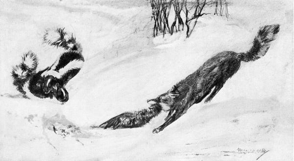In Father Fox’s second year, he was caught in a trap which Fred had cunningly hidden in the snow among a maze of cattle tracks—the last place where a fox would suspect danger. The fox finally managed to work his imprisoned foot out of the gripping jaws; but it had cost him four toes to learn that the scent of man or iron meant death to foxes. He never forgot, and he taught Blackcross to fear the tiniest whiff of either. As for dogs, the old fox taught his cub that no dog can overtake a fox going uphill or in the rough, and that shifting sand and running water are the fox’s friends, since his scent will lie in neither. He taught him all the cut-offs, the jumps, and the run-backs of the range, and finally the cherished fortresses where, as a last resort, he might take refuge.