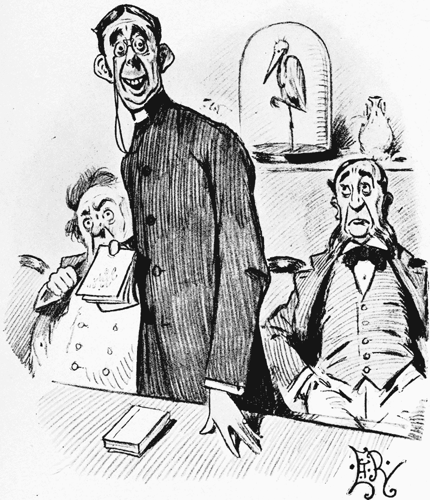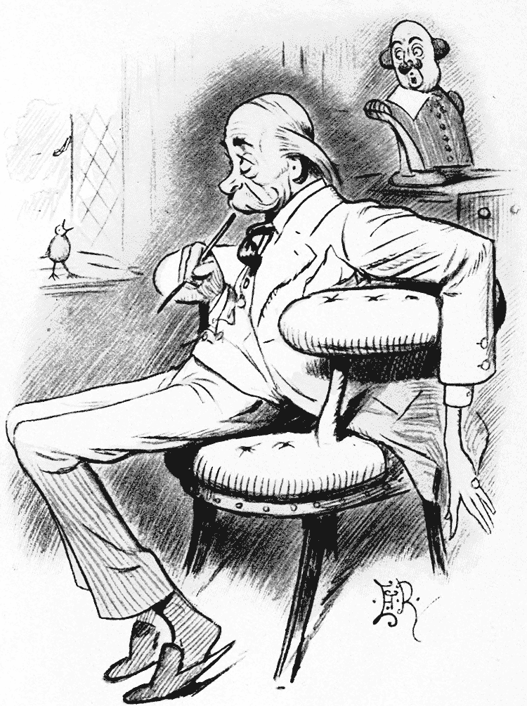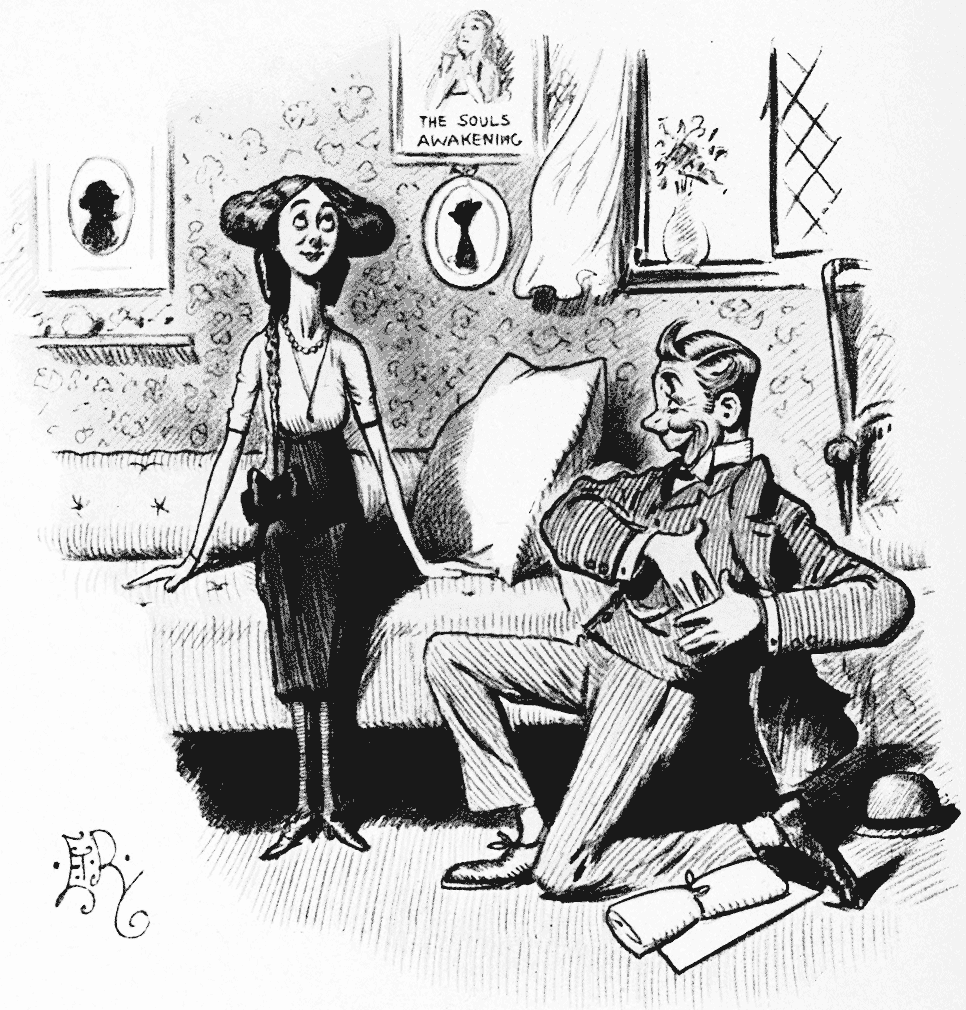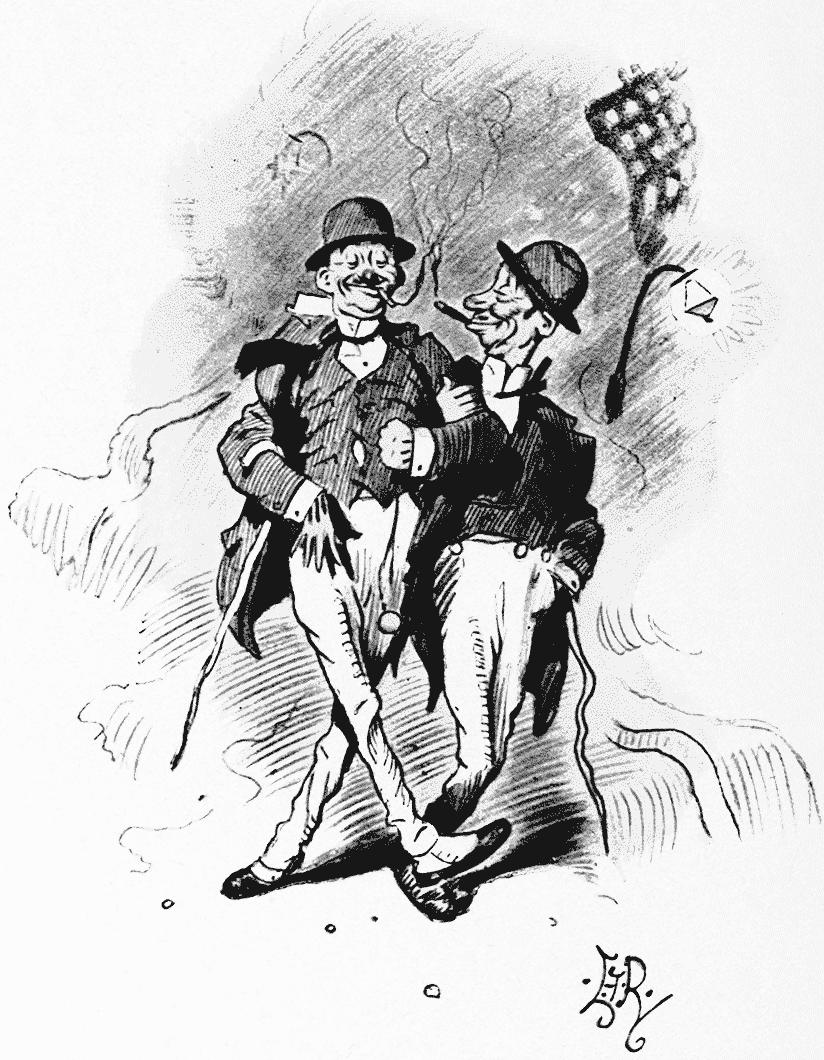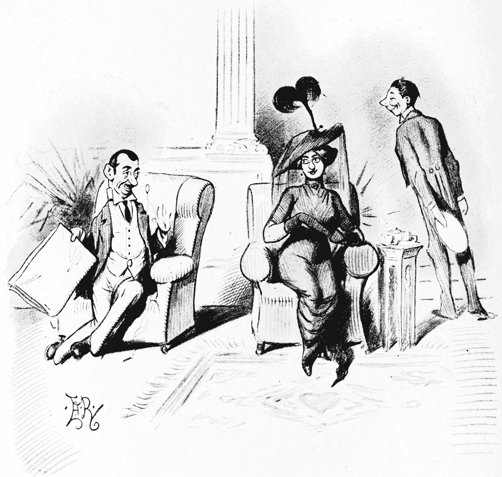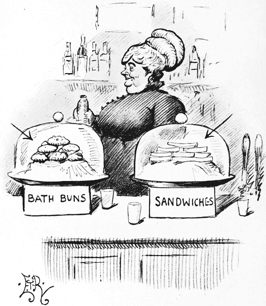 Mr. Bunyon's death put an end to these speculations, and it occurred under the following circumstances. Having met Mr. Rooker by appointment at that gentleman's house, they spent a merry hour at the card table, much to Mr. Rooker's advantage. They then sallied forth in a Taxi-cab; when suddenly remembering that he had parted with all his ready cash, and knowing that Mr. Rooker never paid for cabs on principle, Mr. Bunyon ordered the chauffeur to drive to Attenborough's and there placed his diamond pin in pledge for the sum of £5. Feeling somewhat faint after this exertion, he instructed the chauffeur to drive to a Chemist's where he ordered a pick-me-up. The Chemist not knowing his customer, considered his symptoms a fit case for a dose of "Bunyon's Specific," of which Mr. Bunyon unwittingly partook, and so met his death.