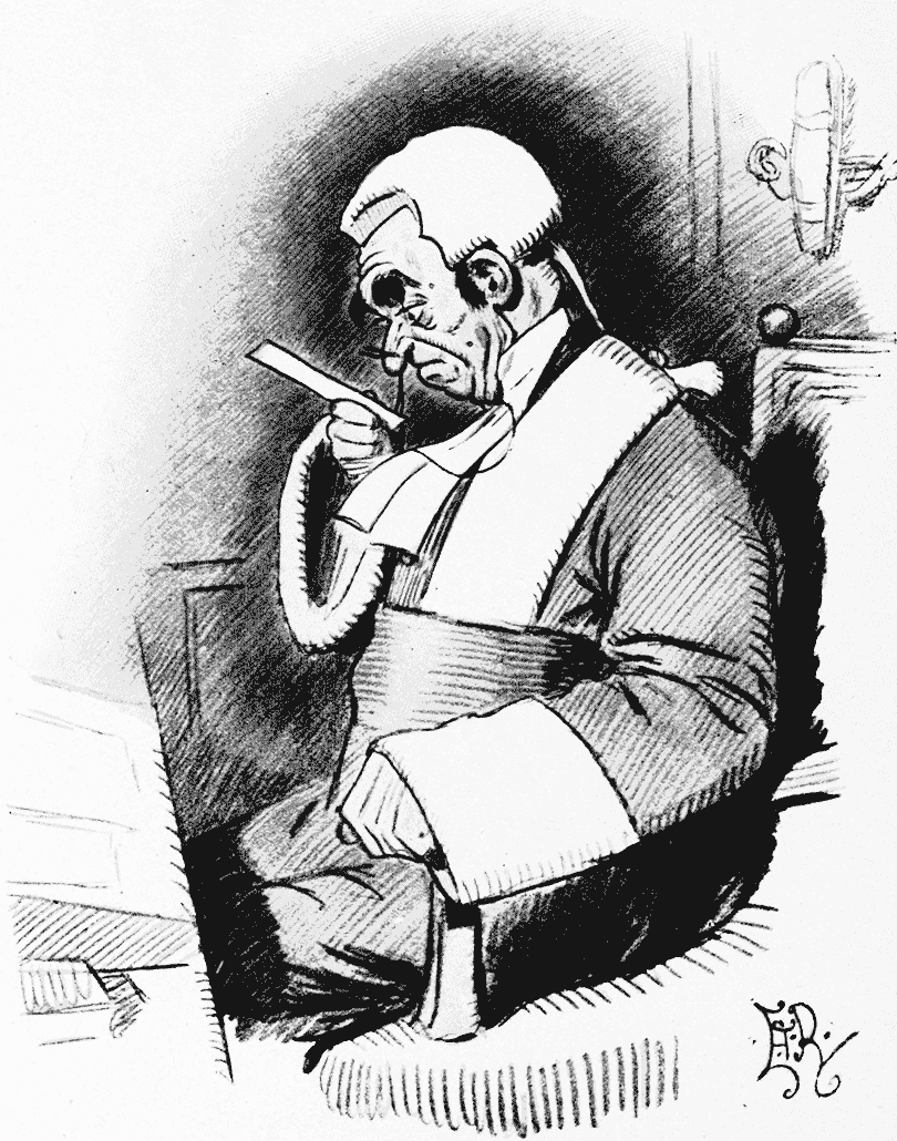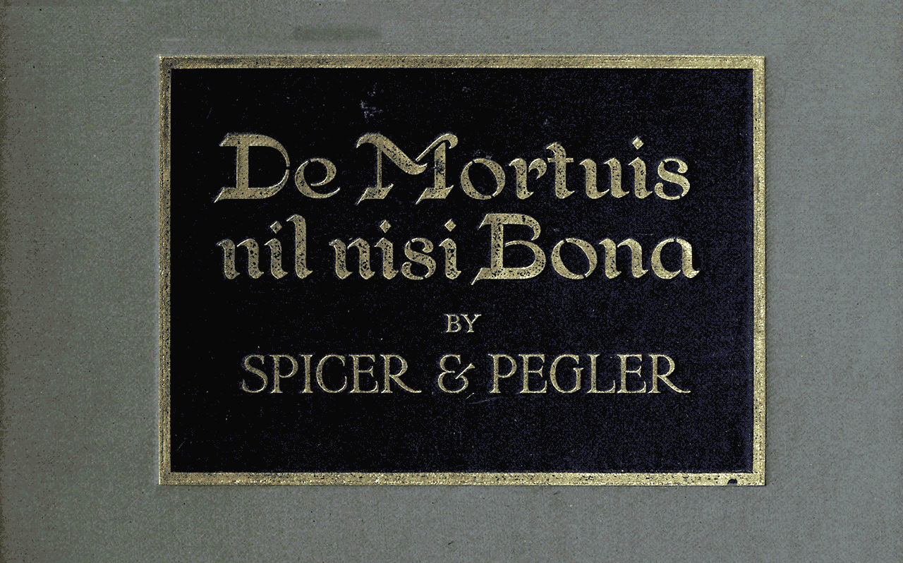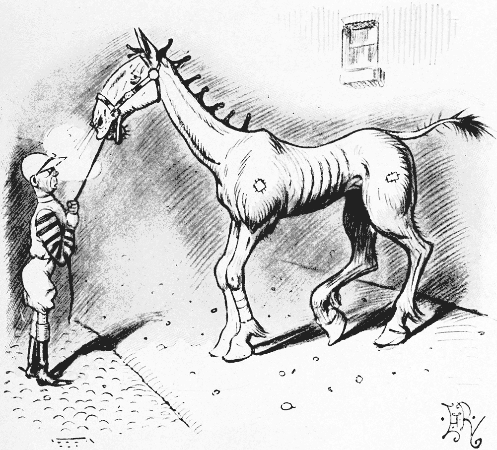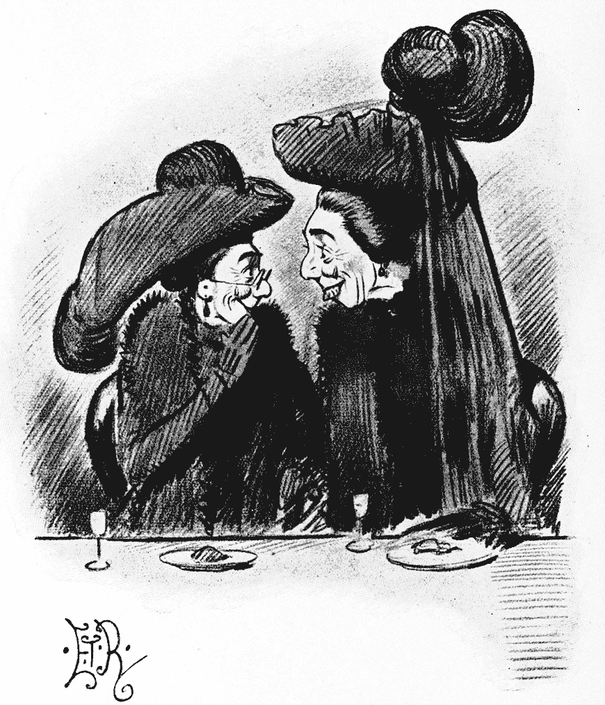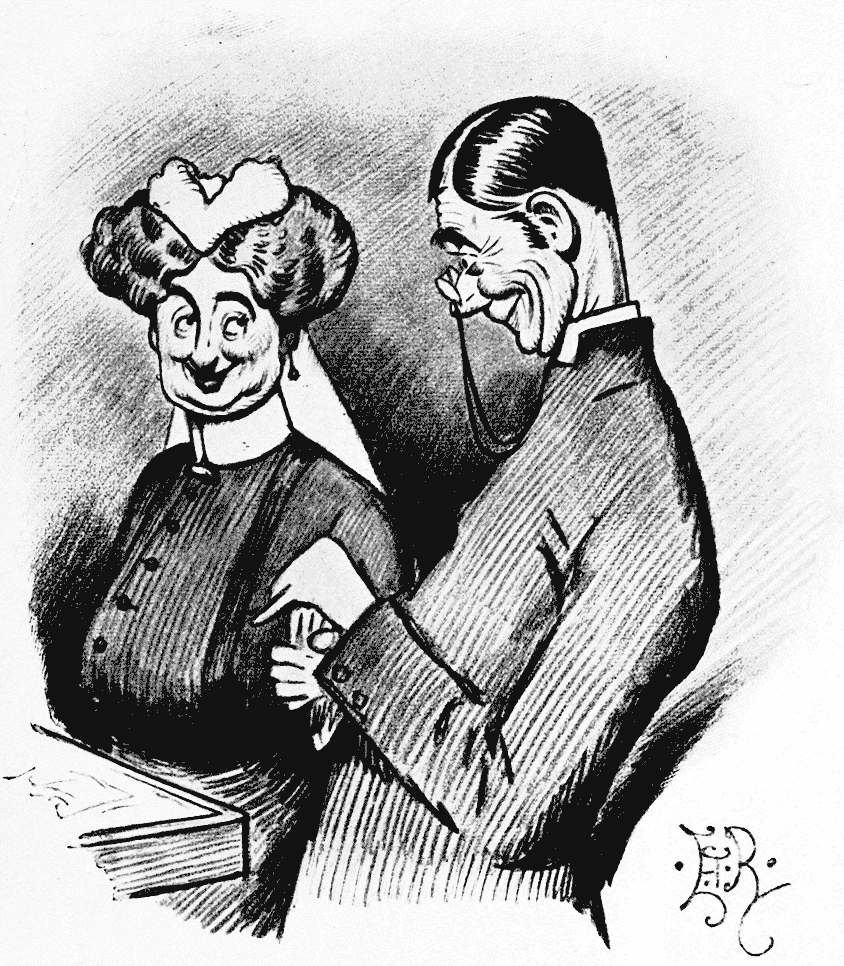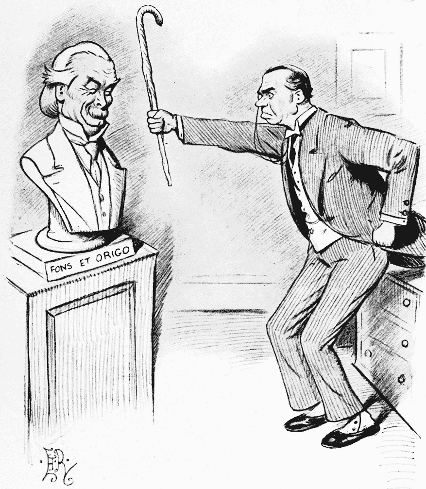 Mr. Bunyon's death put an end to these speculations, and it occurred under the following circumstances. Having met Mr. Rooker by appointment at that gentleman's house, they spent a merry hour at the card table, much to Mr. Rooker's advantage. They then sallied forth in a Taxi-cab; when suddenly remembering that he had parted with all his ready cash, and knowing that Mr. Rooker never paid for cabs on principle, Mr. Bunyon ordered the chauffeur to drive to Attenborough's and there placed his diamond pin in pledge for the sum of £5. Feeling somewhat faint after this exertion, he instructed the chauffeur to drive to a Chemist's where he ordered a pick-me-up. The Chemist not knowing his customer, considered his symptoms a fit case for a dose of "Bunyon's Specific," of which Mr. Bunyon unwittingly partook, and so met his death.
