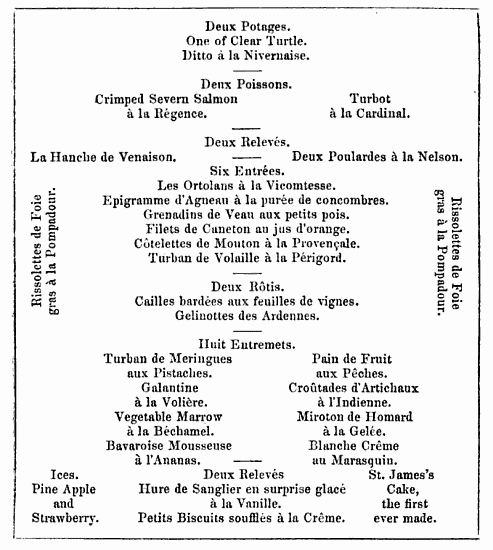 [7] The quantity of the meat and vegetable should pretty equally balance with each other; after such a meal, a man’s appetite is perfectly satisfied, and he is ready for an afternoon’s work if required. It also does not require the aid of any fire, which we so ungratefully abhor in hot weather. Mr. B. very much approves of it once a week in summer.