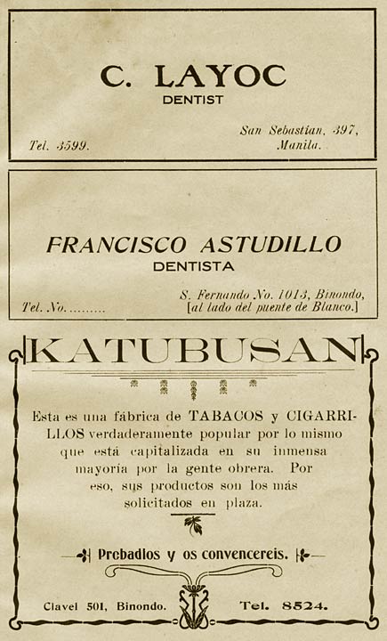 Clavel 501, Binondo. Tel. 8524.