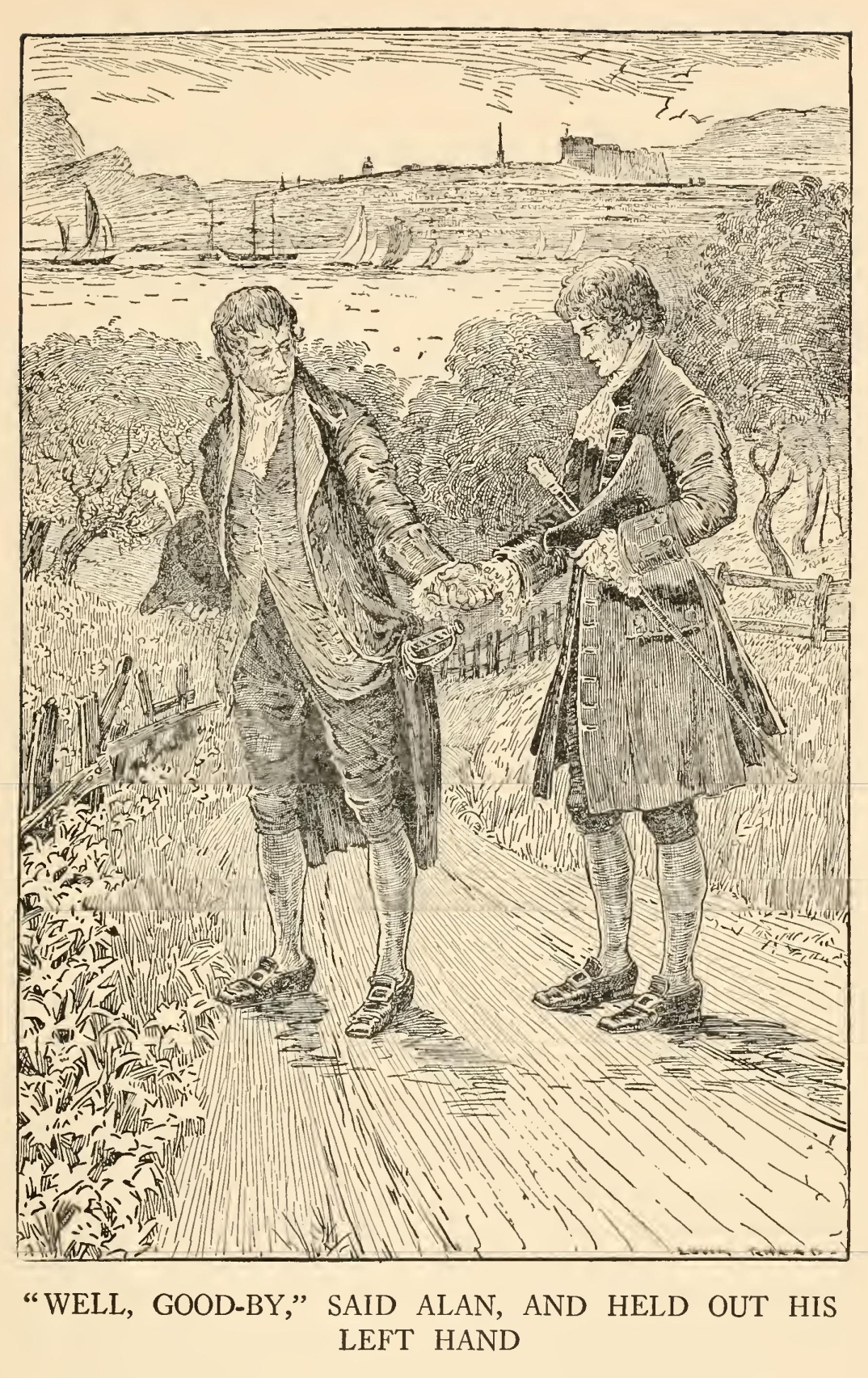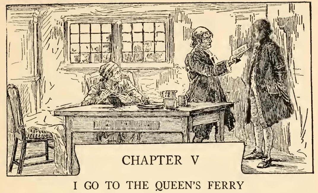 Towards the time I had appointed with Alan, we set out from the house, Mr. Rankeillor and I arm in arm, and Torrance following behind with the deed in his pocket and a covered basket in his hand. All through the town, the lawyer was bowing right and left, and continually being button-holed by gentlemen on matters of burgh or private business; and I could see he was one greatly looked up to in the county. At last we were clear of the houses, and began to go along the side of the haven and towards the Hawes Inn and the Ferry pier, the scene of my misfortune. I could not look upon the place without emotion, recalling how many that had been there with me that day were now no more: Ransome taken, I could hope, from the evil to come; Shuan passed where I dared not follow him; and the poor souls that had gone down with the brig in her last plunge. All these, and the brig herself, I had outlived; and come through these hardships and fearful perils without scath. My only thought should have been of gratitude; and yet I could not behold the place without sorrow for others and a chill of recollected fear.