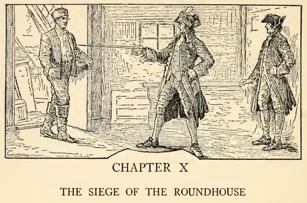 “Eh, man,” cried my uncle, scrambling to his feet, “give me a meenit! What’s like wrong with ye? I’m just a plain man and nae dancing master; and I’m tryin to be as ceevil as it’s morally possible. As for that wild talk, it’s fair disrepitable. Vitals, says you! And where would I be with my blunderbush?” he snarled.