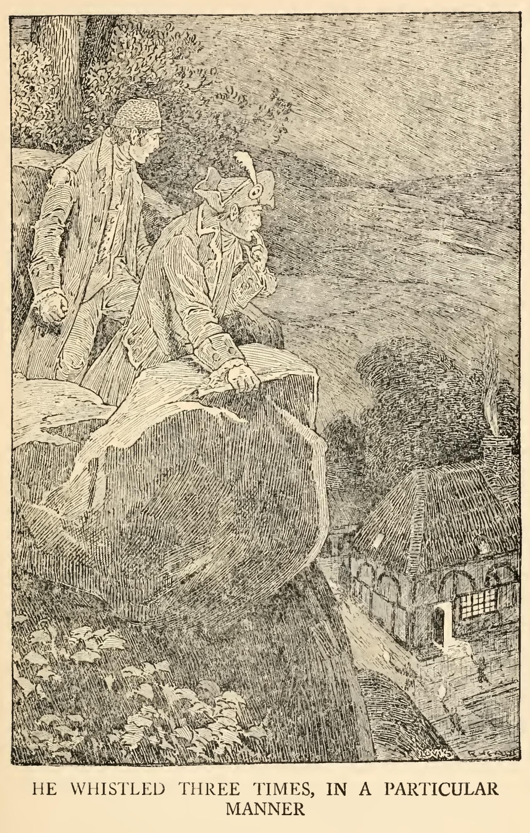 As soon as we were past the Hawes (where I recognised the landlord smoking his pipe in the door, and was amazed to see him look no older) Mr. Rankeillor changed the order of march, walking behind with Torrance and sending me forward in the manner of a scout. I went up the hill, whistling from time to time my Gaelic air; and at length I had the pleasure to hear it answered and to see Alan rise from behind a bush. He was somewhat dashed in spirits, having passed a long day alone skulking in the county, and made but a poor meal in an alehouse near Dundas. But at the mere sight of my clothes, he began to brighten up; and as soon as I had told him in what a forward state our matters were and the part I looked to him to play in what remained, he sprang into a new man.