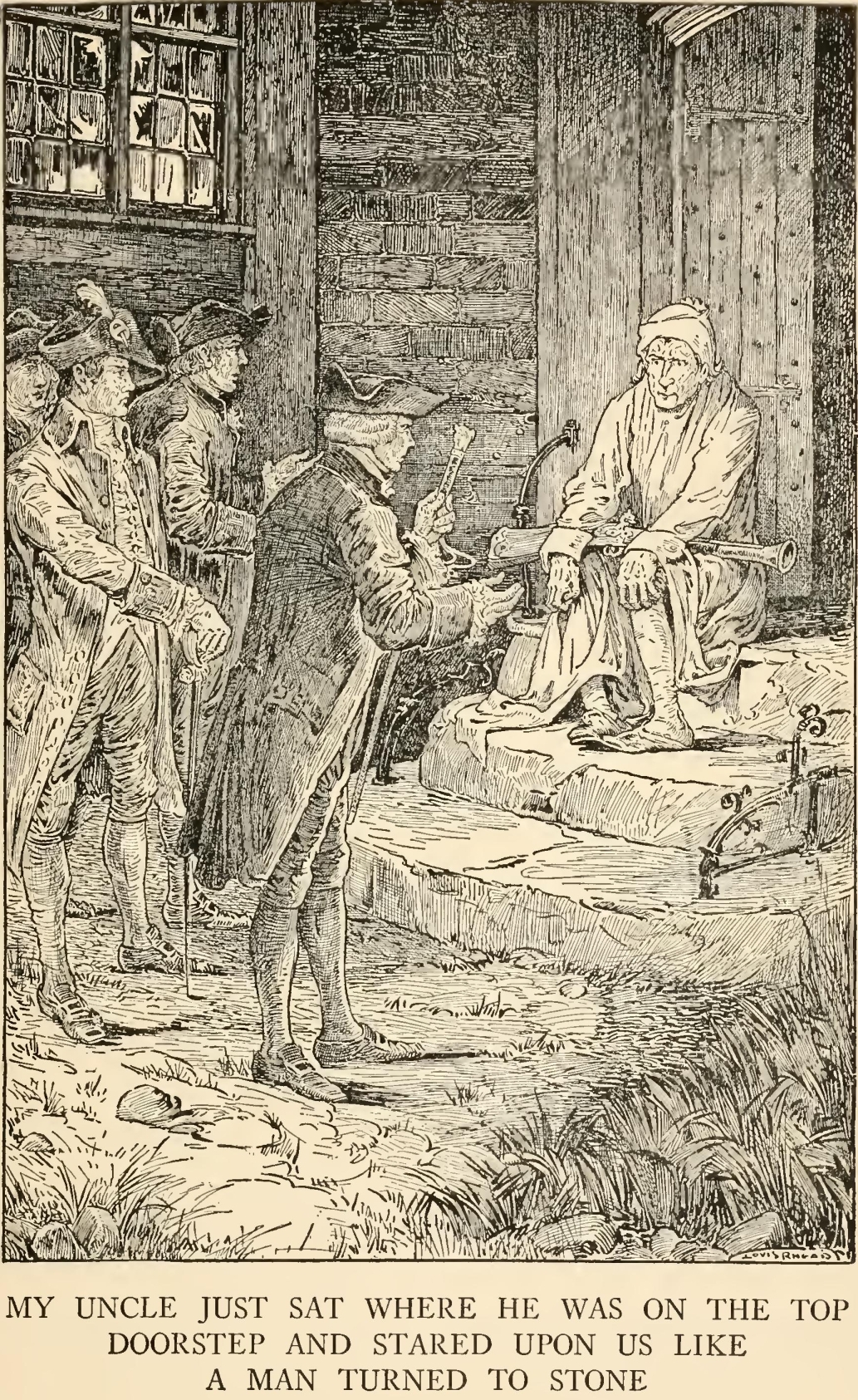 Never a word said my uncle, neither black nor white; but just sat where he was on the top door-step and stared upon us like a man turned to stone. Alan filched away his blunderbuss; and the lawyer, taking him by the arm, plucked him up from the doorstep, led him into the kitchen, whither we all followed, and set him down in a chair beside the hearth, where the fire was out and only a rush-light burning.