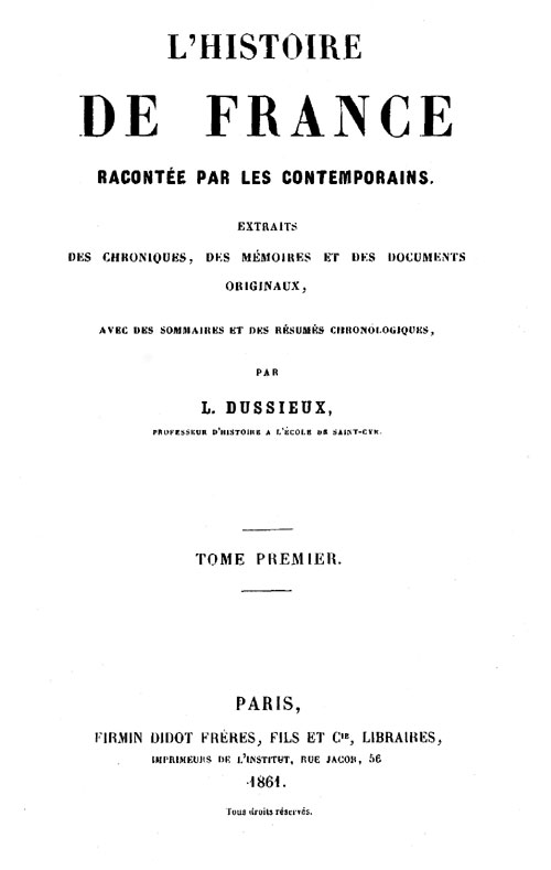 Depuis quelques années, le goût de lire l'histoire dans les documents originaux s'est généralement répandu; de nombreuses publications historiques ont été faites; et déjà l'ensemble de nos diverses collections de mémoires, de chroniques et de documents dépasse plusieurs centaines de volumes, que l'on ne peut rassembler qu'avec difficulté et dont la lecture demande un temps considérable.