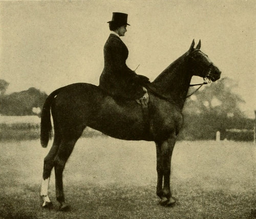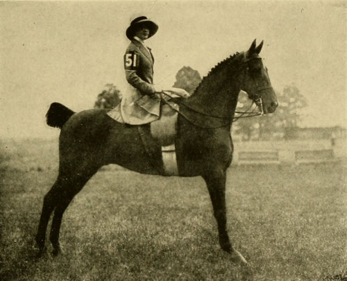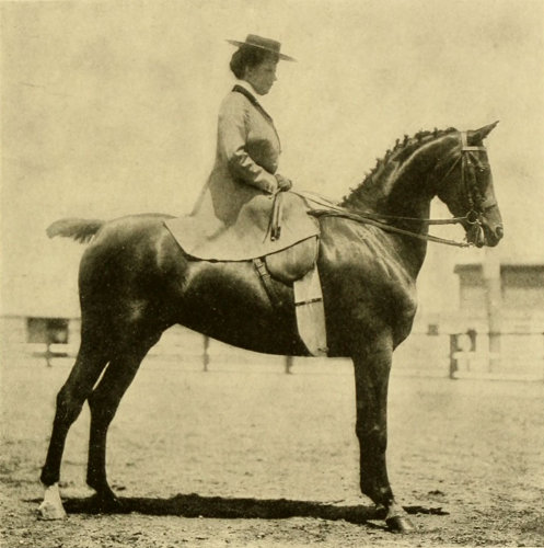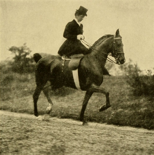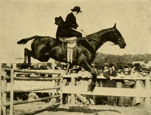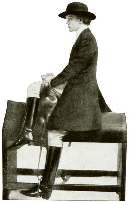 The average woman is not built for cross-saddle riding; her legs from the knee up are too short; her thighs too thick; her hips too big, and she is cushioned too high to enable her to keep close down with the required firmness on the saddle. The side-saddle certainly insures a stronger seat, especially in all cases of pitching forward, as, for instance, with a stumbling horse or a kicking one, or on landing after a jump. With safety skirts and safety stirrups the danger from dragging is obviated and this, the only serious danger in the use of the side-saddle, is more than offset in my judgment by the great danger of a woman being thrown because of her insecure seat in a man’s saddle. Many claim that the cross-saddle is safer than the side-saddle in case of a rearing horse falling over backward. I do not agree with this, for, in the first place, many good men riders have suffered shocking accidents in this way and, when riding in the cross-saddle, unless the rider succeeds in throwing himself clear from the horse, he is almost sure to have one leg broken. On the other hand, with a side-saddle, if the horse comes down on his off side, there is no danger of a broken leg, and when the horse starts to rear a woman can usually make him fall on the off side by pulling his head to that side with all her strength, so that on this point the ease of clearing oneself from a cross-saddle is more than offset by the ability to throw the horse with safety and make him fall on the off side.