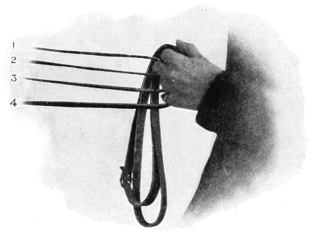 There are different ways of first taking up the reins. One of the best is to grasp them together in the right hand, the curb reins in the middle and the snaffle reins on the outside, drawing them sufficiently tight to feel the horse’s mouth very lightly, with the ends passing through the hand and out under the little finger; then, holding them all horizontal, to pass the left hand down on them vertically, the near snaffle rein outside the little finger, the near curb between the little finger and the third finger, the off curb between the second and third fingers, and the off snaffle between the first and second fingers. Then let go with the right hand and turn the left hand into its position with the ends of the reins coming out between the thumb and forefinger.