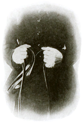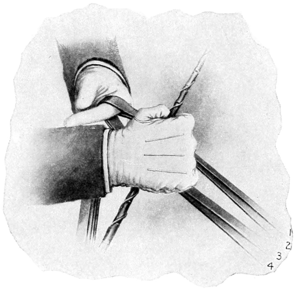 Another purpose for which the right hand must be always available is for shortening the reins. This should be done by grasping the bight or ends of all four reins together in the right hand, behind the left, between the thumb and forefinger, passing through the hand and out by the little finger, and slipping the left hand up on the reins as much as may be needed.