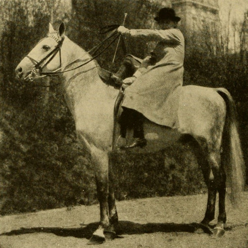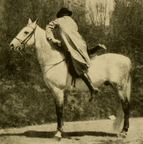 To mount with assistance, the leather being left at its proper length, stand opposite the cantle, facing to the front, place your left foot in the man’s right hand or in both his hands clasped, then at an agreed signal spring from the right foot and have him throw you, but not too high, into the saddle, then place the right knee over the pommel and the left foot in the stirrup.