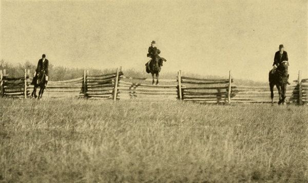In jumping a horse trained to jump in the American fashion, when approaching the jump, the hands are carried well forward and, at the same time, the body is also carried forward. The reason for this is partly to help the horse over the jump, and partly because the horse, before he rises, throws his head far to the front, and the rider’s hands and body move with him. On landing, the horse’s head and with it the rider’s body and hands resume their normal position.
