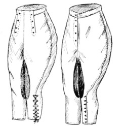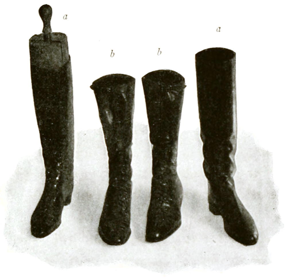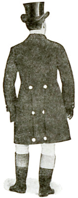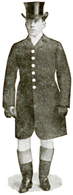 For all formal occasions, such as the show ring and park and town driving, the servant should wear a groom’s dress livery, consisting of a single-breasted long coat with six buttons in front and two rows of three buttons in the back. The coat should come to five inches above the knee and should always be kept buttoned. It should be of the color which the family may have adopted—black, dark blue, dark green, maroon, or gray, etc. The coat collar should be of the same material as the coat and the cuffs should be plain without buttons. Under the coat a waistcoat should always be worn, of some striped material, a small strip showing inside the collar. A plain white Ascot tie and standing collar should be worn, but no cuffs, and the coat sleeves should be very long, coming well down to the hand. The breeches must be white—of buckskin or breeches cloth. Stiff-legged top boots should be worn, with tops of tan or buff, or of some color which matches or goes well with the color of the coat. The boots must always be of calf and never of patent or varnished leather. A silk top hat should be worn, with a narrow silk band. In this country it is improper to use cockades except for officers of the army and navy and other officials. The gloves should be tan, but white buckskin gloves are correct for park or town driving.