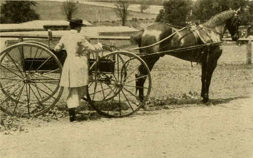 For road work, and particularly for country driving, a tandem cart is not only correct, but is a more practical and suitable vehicle than a gig, particularly with large horses. The driver is well up above the horses, which gives far better control; she is able to see well ahead of the leader, and there is also the advantage of being out of the dust and in a position where one can better see other vehicles, both in meeting and passing them. Whatever kind of vehicle is used, the tugs should be so adjusted that the vehicle is in balance when the shafts are in position. While this is not so important with a gig or a cart whose body is hung on springs independent of the shafts, it is absolutely essential with a tandem cart, or any other cart, where the body is not balanced independently. I wish to lay great emphasis on this point because very few grooms know anything about it, and it is the most common thing in the world to find a horse put to a cart with the girth strapped so tightly that there is no play to the shafts. This is entirely wrong. If English tugs are used, as they should be with a tandem cart, the girth should be so loose that the shafts not only play in the tug, but the tug plays in the girth, and this will usually be done by letting out the girth from four to five holes beyond where it would be if it were tight.