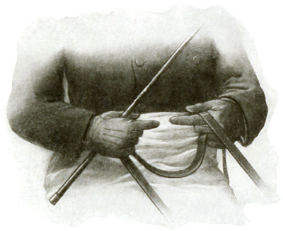 The whip, crop, or stick, whichever may be carried, belongs in the right hand, but the whip and stick are both carried with the handle up and the small end pointing downward whereas the crop should always be carried with the handle downward and the loop end upward. The reason for this is, probably, because in England crops which have handles are used for opening the latches of gates, and, when held in this position, the handle can be quickly used for this purpose without the crop being shifted. Another reason is because, when used in the hunting field with the lash, the lash can be got out quickly, and the crop will be in position for use at a moment’s notice. Whichever of the three, whip, stick, or crop, may be carried, hold it lightly in the palm between the thumb and first finger of the right hand.