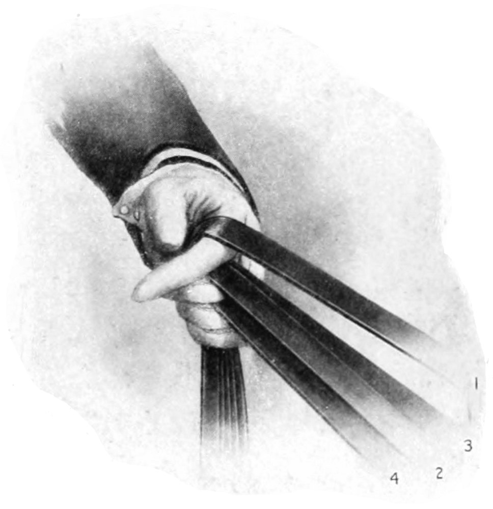 If, however, more strength is required than can be had from the left arm only, the right hand should be placed on all four reins in front of the left hand, which, of course, will have to be turned so as to bring the knuckles horizontal, the reins occupying the same position in the right hand as in the left, only reversed; that is, the off snaffle coming outside the little finger, and the near snaffle between the first and second fingers, etc. The fingers of the right hand are then closed upon the reins and the horse pulled in with all the strength of both arms.