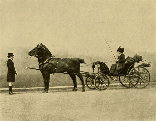 For formal ladies’ traps, such as phaetons, it is perfectly permissible to wear a large hat of the prevailing fashion and an afternoon or calling gown. Where the owner is driving a trap of this kind on a formal occasion, the costume should not be tailor-made, and her costume should produce the effect that she is out for a pleasure drive. With sporting traps and carts of all kinds, on the other hand, the costume should be strictly tailor-made and the hat small and not inclined to blow off. This is particularly so for tandem driving, and in that case the general effect should be mannish, and particular care should be taken to have everything securely fastened so that undivided attention may be given to the horses and reins. For driving tandem, or for any kind of a sporting vehicle or cart in the country, a plain sailor is the most appropriate as well as one of the easiest to keep on, and veils, as well as other feminine adornments, look quite out of place. The hair, of course, should be neatly and securely done, and boots or low shoes are much more appropriate than high-heeled slippers with open-work stockings.