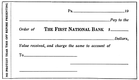 SUGGESTIONS FOR DRAWING NEGOTIABLE PAPER.—Very few suggestions are necessary in drawing checks. We almost always use the printed form. The only thing to be careful about is to draw lines through the blank spaces so that a check written for $70 may not have something else written before the word seventy, thereby raising the amount to, say, One thousand seventy, and the figures, because they are not near the dollar sign, correspondingly raised. The promissory note is frequently drawn by the parties without any printed form. In order to be negotiable, the note must bear the words "or order," or "bearer"; otherwise, it would not be negotiable, and would pass by the law of assignability[Pg 403] without any of the advantages accruing to negotiable paper. The draft, or bill of exchange, is the document which the average layman is the least familiar with, and before drawing one, a printed form should be secured or a book on negotiable paper be consulted.