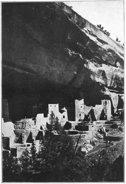 We are forced to conclude that they [cliff-houses] were abandoned later than the villages on the mesa. Some features, for example, the superposition of walls constructed with the greatest proficiency on others built in a more primitive fashion (see plate xiii) indicate that the cliff-dwellings have been inhabited at two different periods. They were first abandoned, and had partly fallen into ruin, but were subsequently repeopled, new walls being now erected on the ruins of the old. The best explanation hereof seems to be the following: On the plateaux and in the valleys the Pueblo tribes attained their widest distribution and their highest development. The numerous villages at no great distance from each other were strong enough to defy their hostile neighbors. But afterwards, from causes difficult of elucidation, a period of decay set in, the number and population of the villages gradually decreased, and the inhabitants were again compelled to take refuge in the remote fastnesses. Here the people of the Mesa Verde finally succumbed to their enemies. The memory of their last struggle is preserved by the numerous human bones found in many places, strewn among the ruined cliff-dwellings. These human remains occur in situations where it is impossible to assume that they have been interred.
