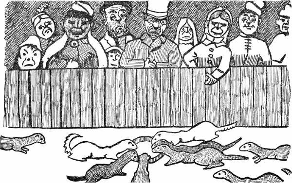 So we say positively that the rat is Chinese, and there is no record that can prove the contrary. The rats were kept locked up in that great empire of solid fences before they showed themselves to the other countries of the earth. Forty years before the great Ver and Rect battle, 750,000 big rats, with their tails out straight, like real Chinese pig-tails, concluded to make an exodus out of the heavenly territory, under the leadership of 75 big chiefs. They didn't want to[Pg 65] leave particularly, but they were afraid of being starved out altogether, or else murdered for food by the Chinese army. After the rats had put themselves in battle array, and were duly formed in procession, the 75 big chiefs, who were distinguished from the others by their big red noses and muscular forms, held a council. At the end of a three days' session, during which a great many speeches had been made and a good deal of fighting had been going on, a very old political rat-boss arose and made a proposition. His speech was about as follows: "Honored Rats, and fellow-citizens: I have been a rat for a good many years, and don't want to change my business. I must say I like being a rat. But if we are hacked up in soup, or starved out completely, I have my doubts of our staying powers. Countrymen and lovers, this is what we are threatened with, and we must move. Where to? is the question that arises, and I have thought it over. The climate is hot to suffocation and very unhealthy here; let us trust to luck and go west, as a friend of mine said on a similar occasion. 'Go West, young man, go West,' I say unto you now, and I advise you to do so as speedily as possible." This speech was received with "tremendous applause" for the old rat waxed very eloquent, and the "go west" resolution was passed unanimously. An amendment was put in, changing the course to north-west, for the meeting was held during such hot weather, that some of the radicals wanted to start out immediately and settle on the North Pole. They were promptly overruled, of course, and the 750,000 rats, including males and females, wandered on slowly in their chosen direction, increasing on the road to a wonderful extent. The[Pg 66] council concluded to hold a thorough count or census of rats, and each male rat, it was provided, should not be bashful about coming forward and giving the true number of his whole family—no doctoring of the returns allowed. After the count was completed, all the rats over and above the original amount, 750,000, agreed to stay in the country they had arrived at. The originals kept on moving towards the north-west, but the others filled up every section of the earth they passed through. The rats made friends with neither man nor animal on their journey. First they made a stop in a state where all the owls—although they were countrymen of the rats, having emigrated from China—fell upon them, and there was a pitched battle, the rats afterwards hiding themselves in their holes under ground after losing a great many in dead and wounded. One day they agreed to make an excursion out of the line of their route and so take in Egypt. In a few weeks they here ate up all the corn from the fields, stealing and hiding away anything edible, and quite creating a panic, but always fighting shy of the daylight. We read in the histories of a great locust plague in Egypt, about this time, but on this point we have a revelation to make. The locust was just as innocent of this crime as it is of building the Brooklyn Bridge—it was the rats that did it. When the rats arrived in Greece they scored a signal victory, because it was there that they extirminated a whole nation—the mice—and the former have strongly held this country ever since. We are authentically informed, by reference to our own private rat historian's notes of this trip, that the first place the rats met their great enemy, the Dog, was in Ancient Rome, where the[Pg 67] dogs were put on them by man with much success, and here the rats could get no firm foothold. This caused them a roundabout journey north, and when they thought they had pretty well established themselves in ancient Gaul, now France, they were raided by a strange tigerish kind of animal which proved afterwards a lasting antagonist of theirs—the Cat. The poor rodents found here the other enemies they had encountered on the road, the owl and the dog, who were always urged on fiercely by man. While the rats were struggling along in France, the land was convulsed by an earthquake, causing the Atlantic river's banks to be overflowed. This submerged the land on which the rats were, and as they all could swim they headed their course for England, the nearest dry land. It was here the ferrets joined man, dogs, cats and owls, but the more the rats were hunted, the more acute and crafty they got to be, until they found out innumerable hiding-places and ways of preservation, so we have them still with us to-day. We thus close our story of research, through which we have shown America as the birthplace of the ferret, China of the rat, and England as the first country employing ferrets for rat-hunting.
