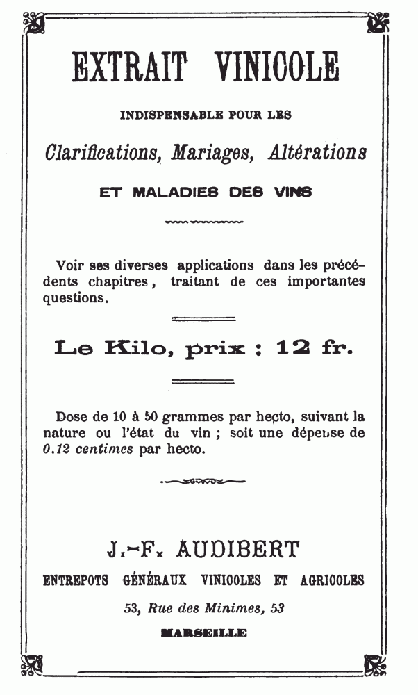[52] Le Tannin à l’Alcool, prix.: 8 fr. le kilo, est un article exclusif et garanti des Entrepôts Généraux Agricoles et Vinicoles, 53, rue des Minimes, Marseille.