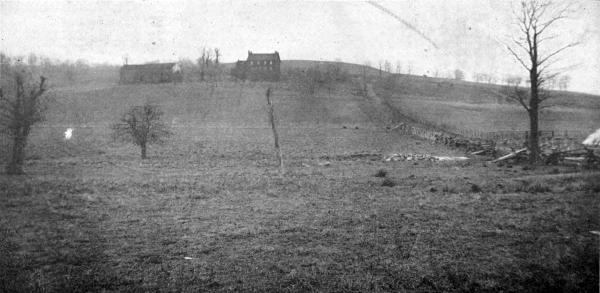 The outline of the Southern embankment is in the fore-ground. The hill is locally known as Mount Washington; the brick mansion stands on the old National road and was known as Sampey’s Tavern. From this hill the French first attacked the little Virginian army under Washington in the fort.